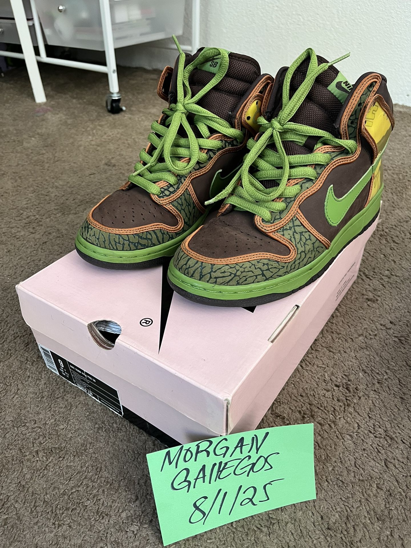 Nike SB De La Soul High Men’s size 9. Looking for $210 obo Shoes are used with flaws. Heel drag, laces are damaged and the holo decal is cracking. Shoes are 100% Authentic.