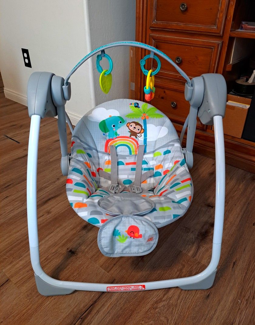 Bright Starts Playful Paradise Portable Compact Baby Swing with Toys, Unisex, Newborn + Item is brand new (Open Box). Still has tags. Warranty hasn't even started yet. Comes with new Energizer batteries already installed. The retail price is $59.99-69.99. Bought a couple weeks ago for a friends baby, and she didn't need it after all. Amazing discount on brand new swing! First come first served.