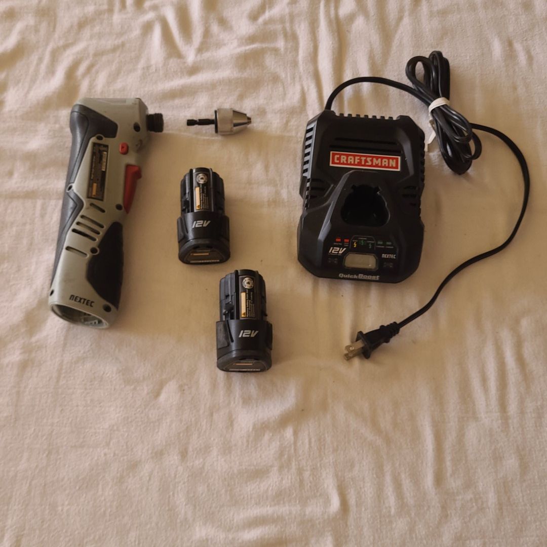 1- 12 volt nextec right angle impact driver. Runs great, maybe used 10 times. 2- 12 volt batteries. 1- charger. 1- drill bit chuck