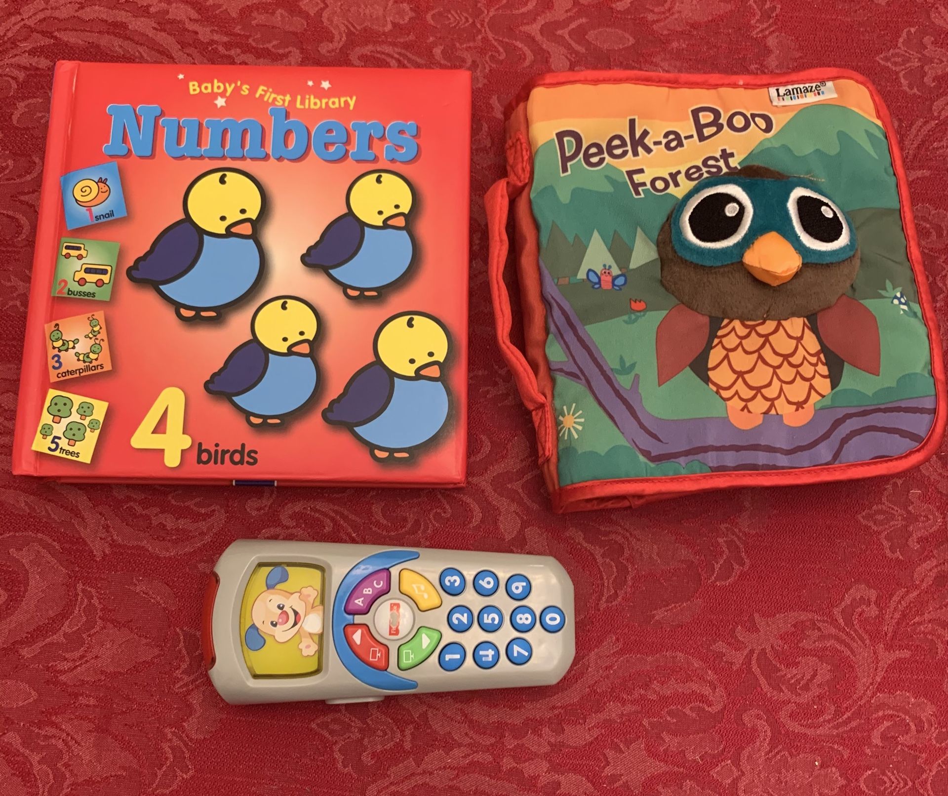 Books and toy in good used condition. The board book has beautiful colorful pictures. The peek a boo forest book is soft and allows your little explorer to learn about different animals that live in the forest. It has flaps that are easy for little fingers to open and close, promoting hand-eye coordination. The bright colors, multiple textures and surprise crinkles encourage exploration. The TV remote was well love by my baby. Loaded with buttons, songs & learning fun, interactive Laugh & Learn by fisher price.