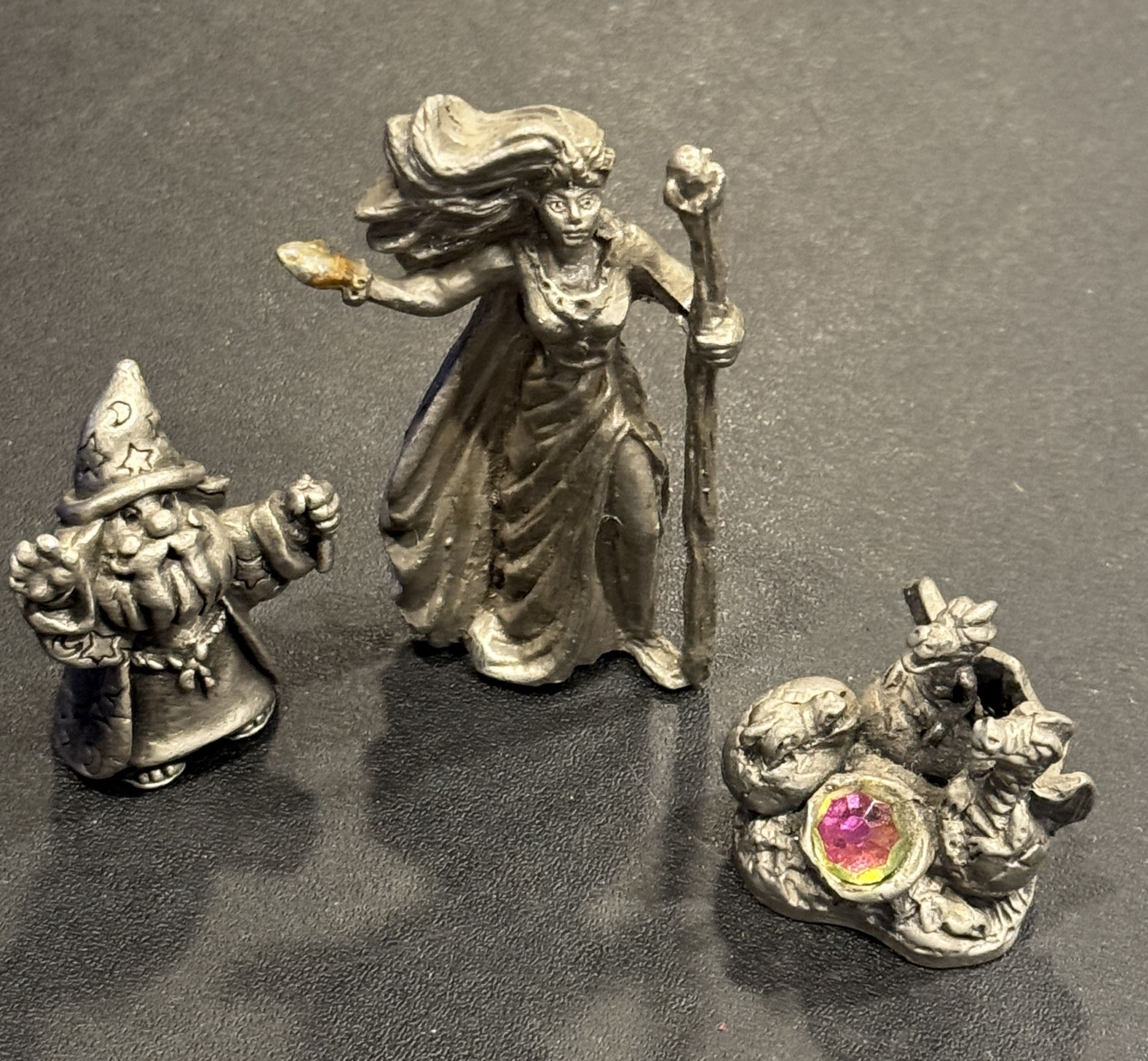 1. Hatchlings Pewter Dragons 3562 WAPW Copyright UK. These delightful little dragons have hatched into a wonderful new world. They have been greeted by a colorful orb to show them the way. This tiny duo is a mere 1.25 inches high, but will add whimsy and charm to any collection. 2. Ral Partha Female Wizard missing crystal ball 3. Medieval Wizard Warlock Fairy Tale Diorama Figurine wearing a pointed cap, robe & holding a star wand in his hand from The Little Kingdom Collection by Hudson pewter. The figurine measures 1 1/2" tall 1 1/4" wide and 5/8" deep. The bottom is stamped "1984 Hudson Fine Pewter USA 3148
