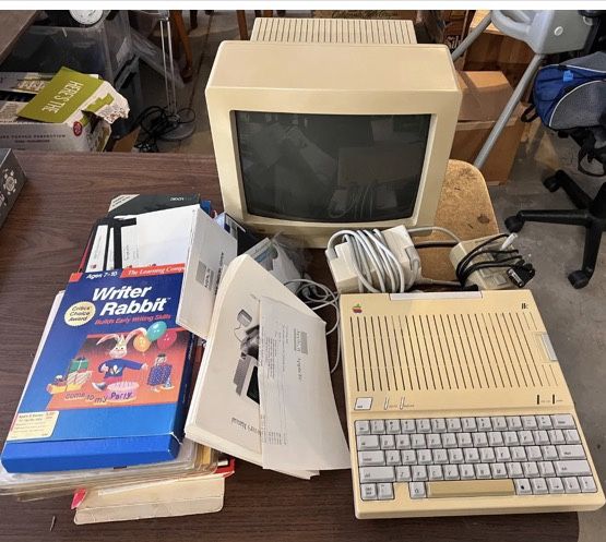 Born August of 1987, all original cords, power supply, monitor, keyboard, joystick, original invoice, owners manual, Apple IIc user guide by Lon Poole, large and small Apple logos, original floppy programs (The Apple at Work, Getting Down to Basic, Apple II System Utilities, The Apple at Play, and Exploring Apple Logo), original games (Rendezvous, Lode Runner, EPYX The Games, Jet by subLogic, Wings of Fury, Wings of Fury, Writer Rabbit, Easy Working from Spinnaker, and HardBall by Accolade). I will not break up this set. Fully operational and fun. This package has it all in one. I will ship this set by a separate invoice and thru the US Postal Service. At the expense of the buyer. The packaging is complementary.