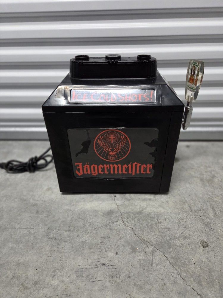 Has some wear and tear but works great. Jägermeister Tap Machine, specifically a JEMUS model designed to chill and dispense Jägermeister shots. This model is designed to hold and chill three Jägermeister bottles, ensuring the liqueur is served at an optimal ice-cold temperature, typically around -18°C (-0.4°F). It's commonly used in bars and restaurants for efficient and precise dispensing, but smaller versions are also available for home use. The machine features a tap system for easy pouring and often includes LED illuminated elements for increased visibility and impulse sales. Proper cleaning and maintenance are recommended, especially due to Jägermeister's high sugar content, to prevent clogging and ensure longevity.