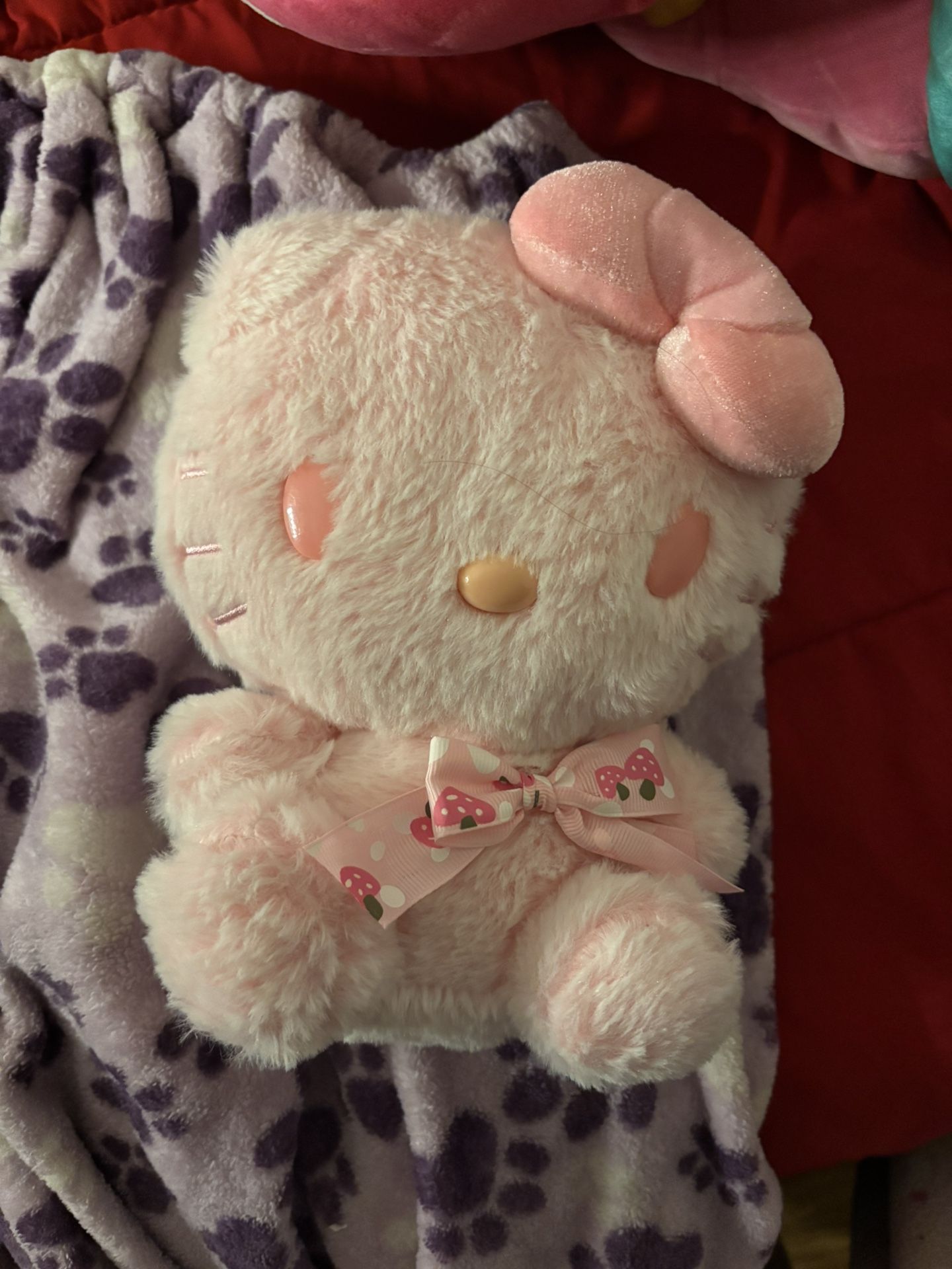 Adorable pink Hello Kitty plush toy. Soft, fluffy texture. Small bow on chest. Pink bow on top of head. Minor discoloration on back.