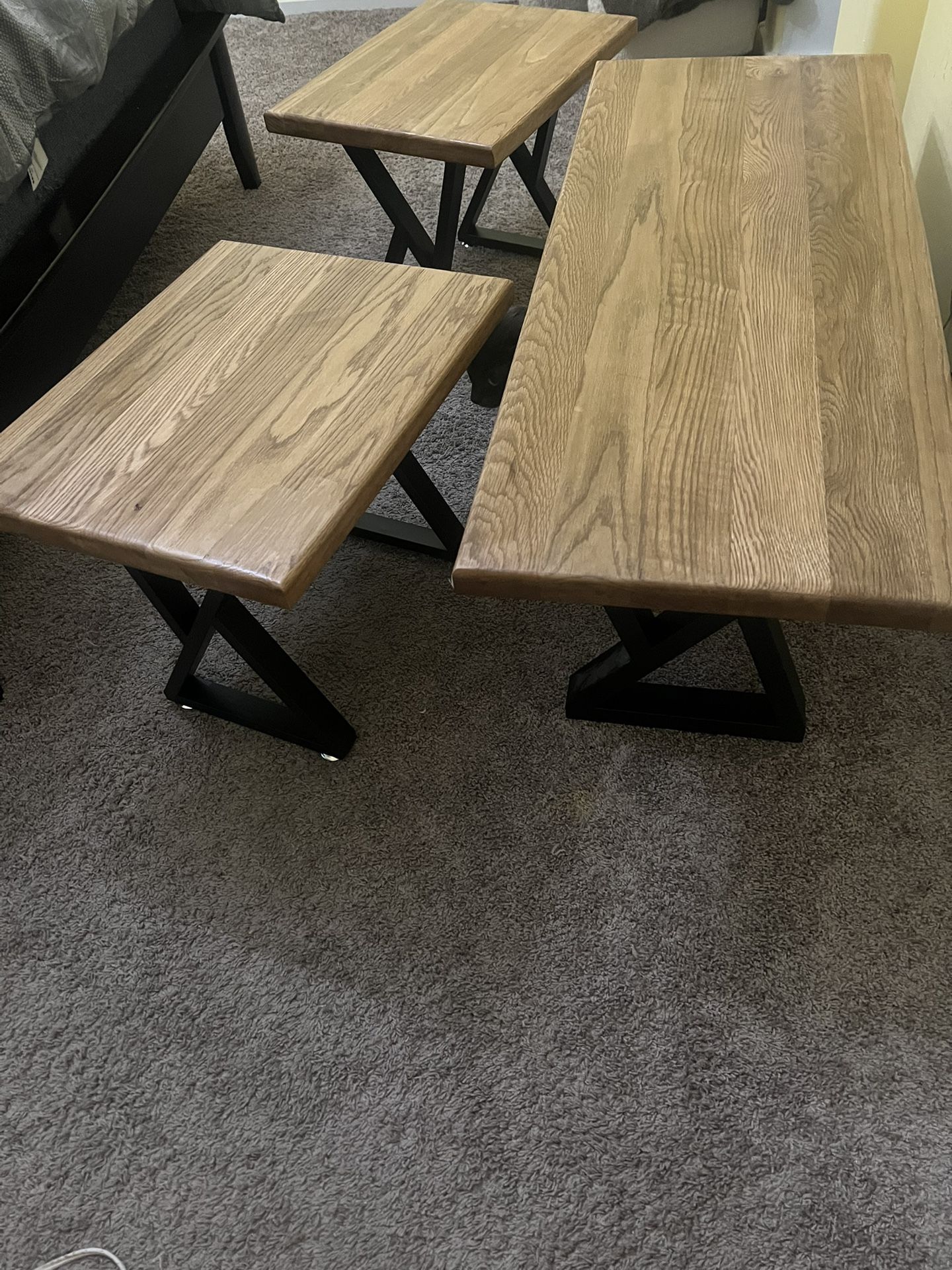 Selling solid wood handmade side table and coffee table. $100 for whole set or 40 for the side tables and 60 for the coffee table. Very well made and sturdy