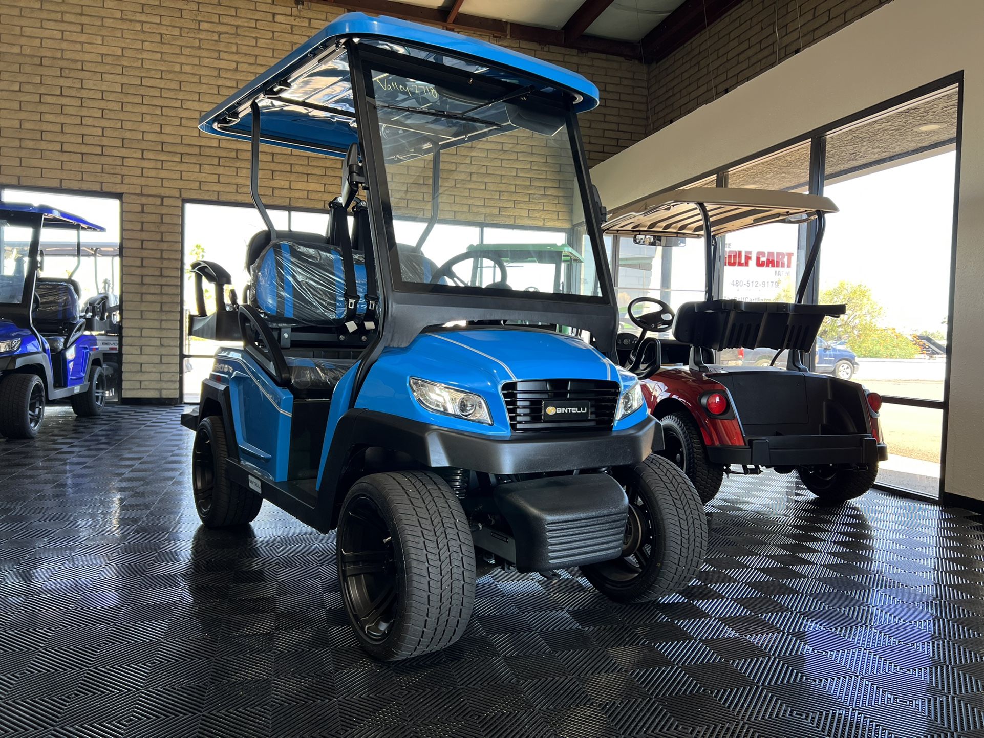 Brand new 2023 Golf Cart with a Backseat. This golf cart is street legal. It drives very well and goes 25 MPH. It has nice seats, a back up camera, 14” custom wheels, cooler, windshield wiper, turn signals, a Bluetooth sound system. The golf cart also has an aluminum frame, AC motor, speedometer and odometer, LED lighting, 14″ wheels, reverse camera, hydraulic disc brakes, two-tone premium seats, on-board smart charger, dual USB plugs, extended roof, rear flip seat, head lights, tail lights, turn signals, DOT windshield with wiper, DOT tires, DOT 3-point seat belts, and a 17 digit vin number and new US Batteries. The backseat flips down in to an optional utility bed and has a hidden cooler Comes with a 4 year manufacturers warranty from Bintelli. $12,200 total out the door and includes sales tax, title, and free delivery in the east valley.