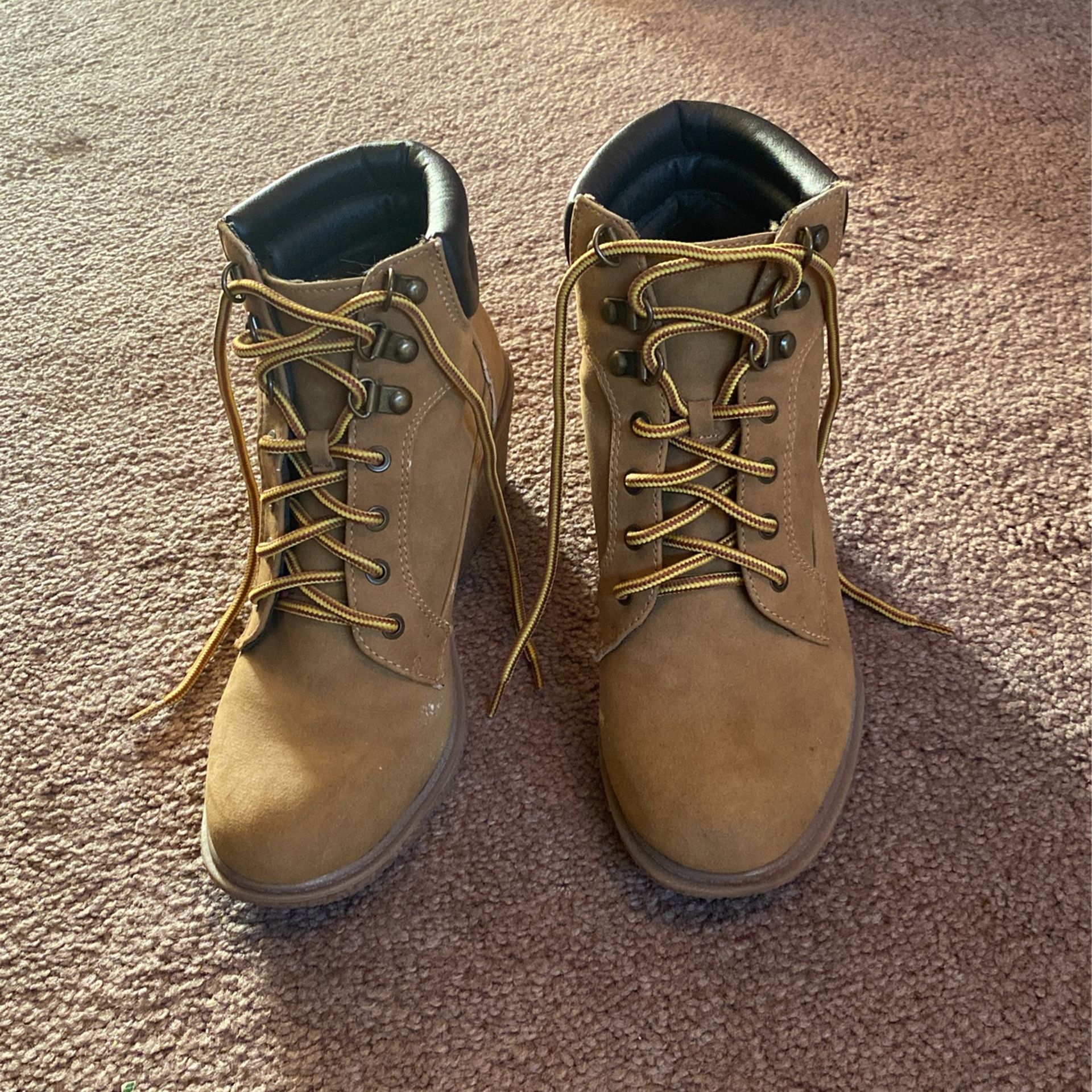Good condition, hardly used. One boot has a front scrape but hard to notice from walking distance. Look like timberlands.