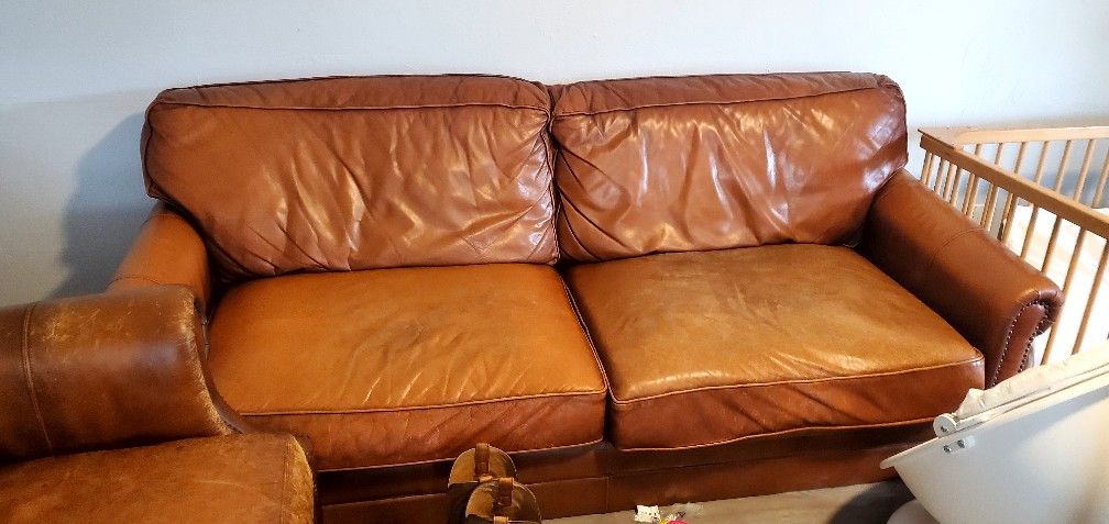 Real leather one rip on the the top on the couch. Comes from home with dog and smoking