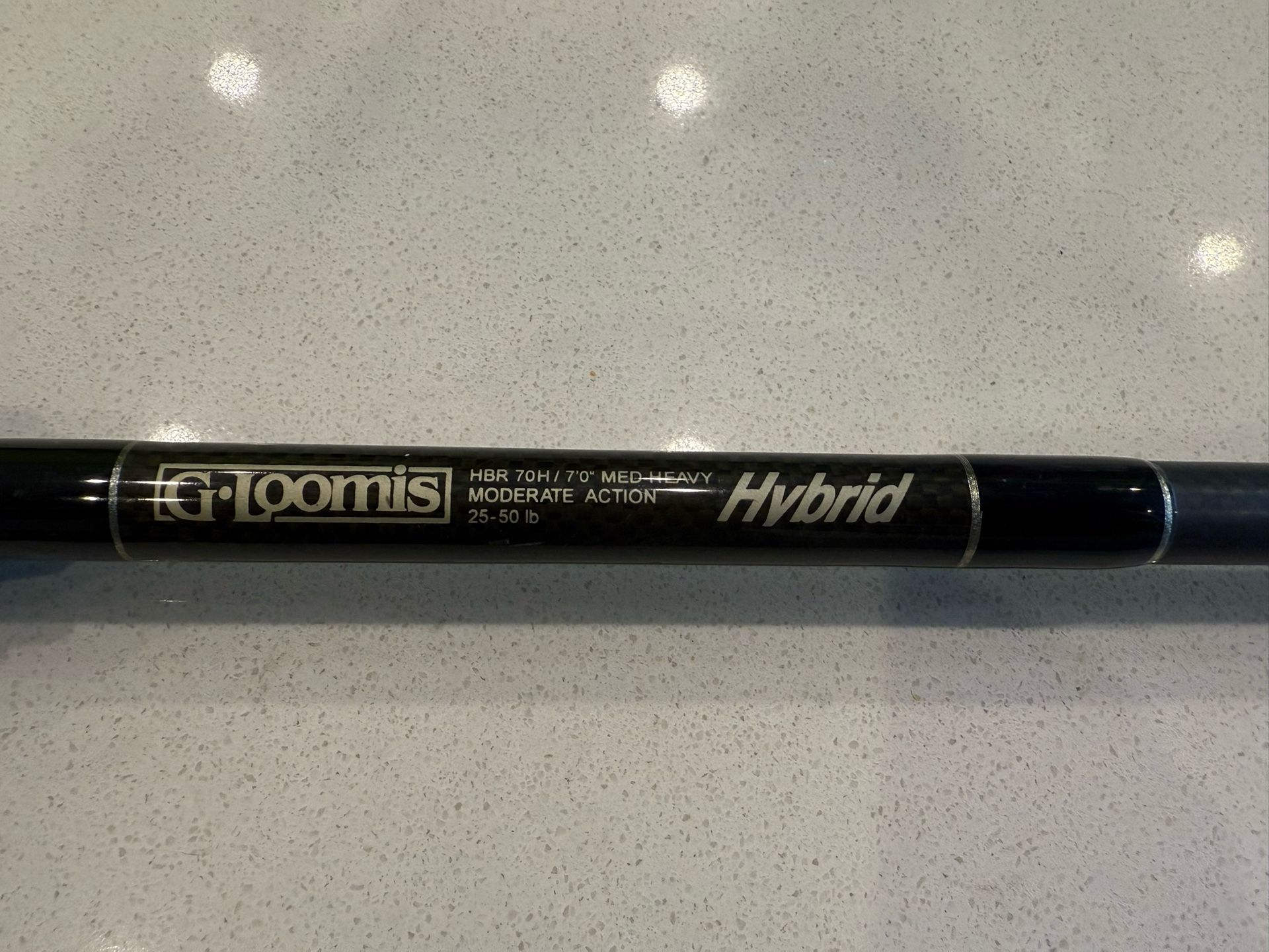 GLoomis hybrid HBR 70 H 7' MED/Heavy Moderate Action 25-50 LB. This rod has been discontinued and hard to find, those who are looking for one know. Guides are in good condition, 1 or 2 guides have some black paint missing but none are showing signs of rust, and guides are secure and strong. Do not need to be rewrapped like some hybrids you see, it's ready to fish.