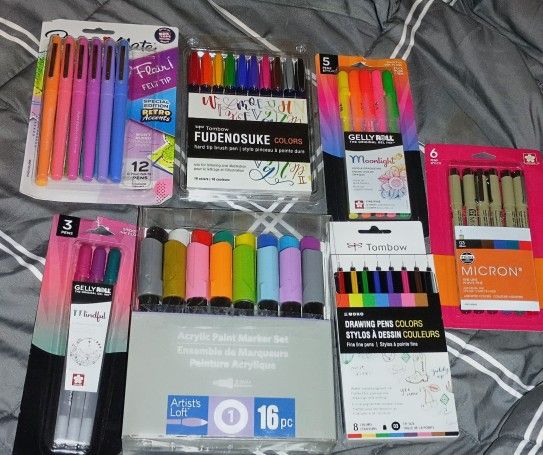 Brand New in Boxes!! 7 PIECE ART MIX 1. TomBow FUDENOSUKE COLOR - Hard Tip Brush Pens - 10 Color's 2. Craftsmart PAINT PENS - OIL HUILE 6 Piece Fluorescent Set- Broad Line Ideal for Wood, Plastic,Metal & Glass Water- Restitant When Dry 3. Craftsmant PAINT PENS MEDIUM TIP, OIL Based 14 Piece Set 4. MICRON FINE LINE 03 .35MM ARCHIVAL INK 6 Piece Set 5. SHARPIE CREATIVE MARKERS Paint Effect NO BLEED,Brush Tip Effect Peinture POPS ON LIGHT & DARK SURFACES 5 Water- Based Acrylic Markers .3 Piece Set 6. CRAFTSMART PAINT PEN SET BROAD LINE - POINTE LARGE Ideal for Wood ,Plastic,Metal & Glass Water Resistant 7. TOMBOW DRAWING PENS FINE LINE Water -Based pigment ink ,.03 Tip size ,8 Piece Set