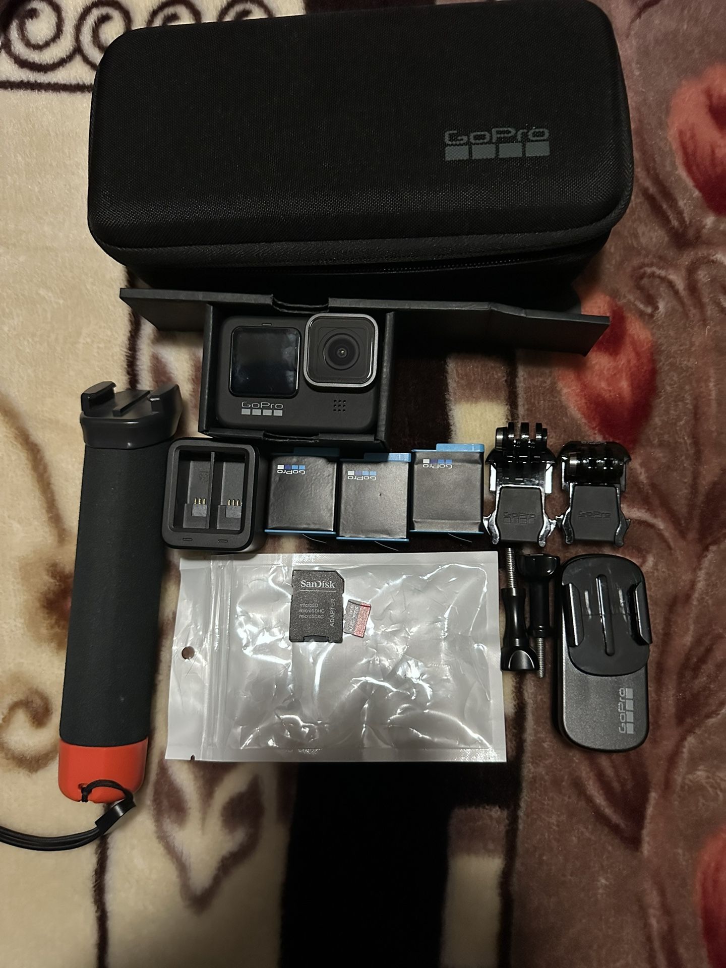 Gopro 9 Black With Three Battery as Well Battery Charger and sanDisk 512GB memory card, also screen protector, front camera as well screen