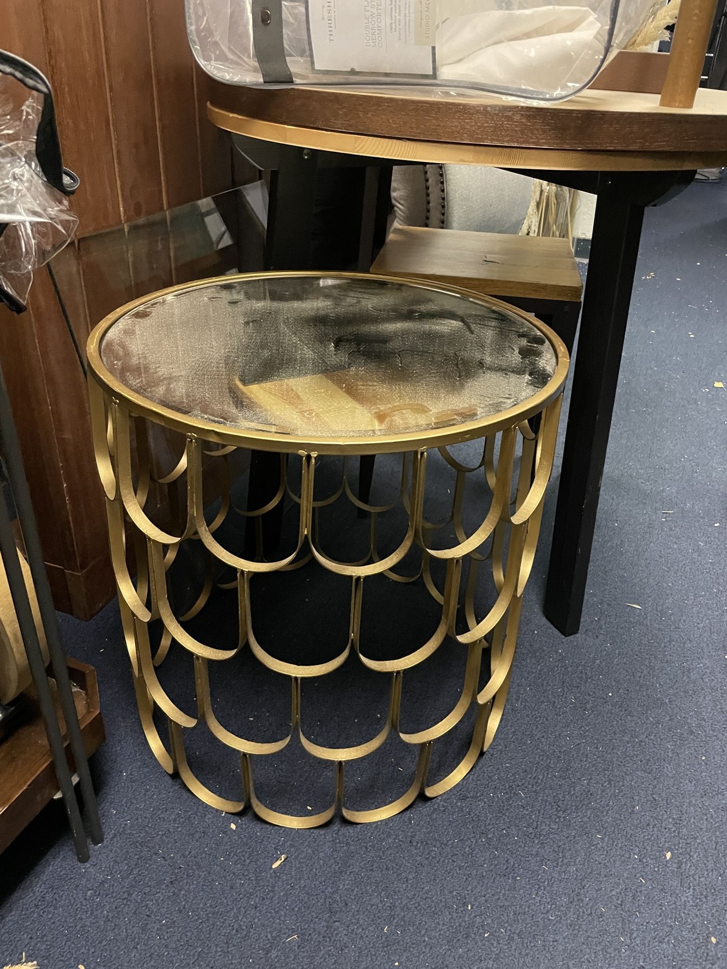 Round Mirror End Table With Gold Accent Size: 21.5” tall /21” round