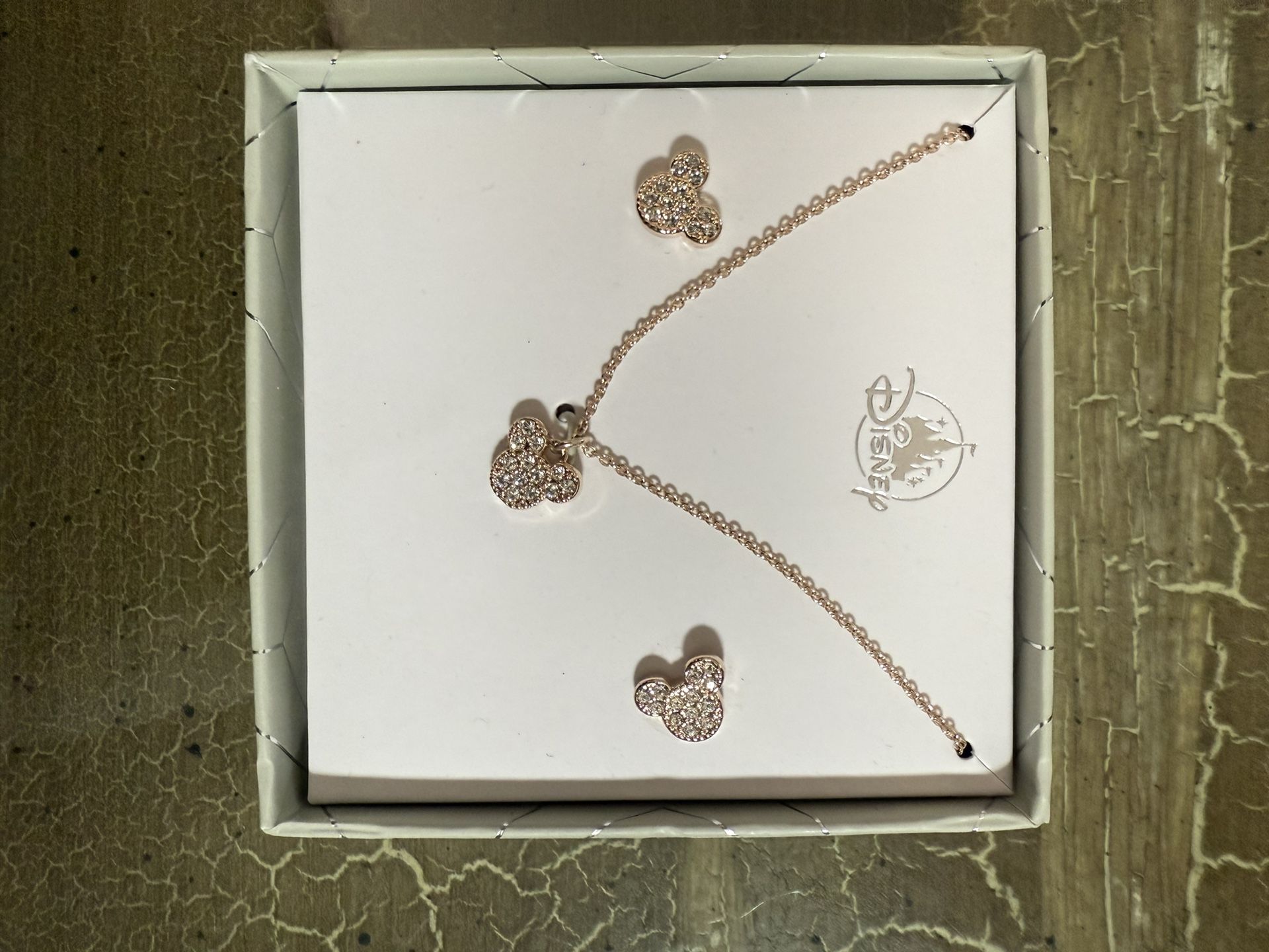 Set that comes with necklace and matching earrings. Was packed in move and the box did sustain minor damage (see pictures) besides that the actual set is pristine.