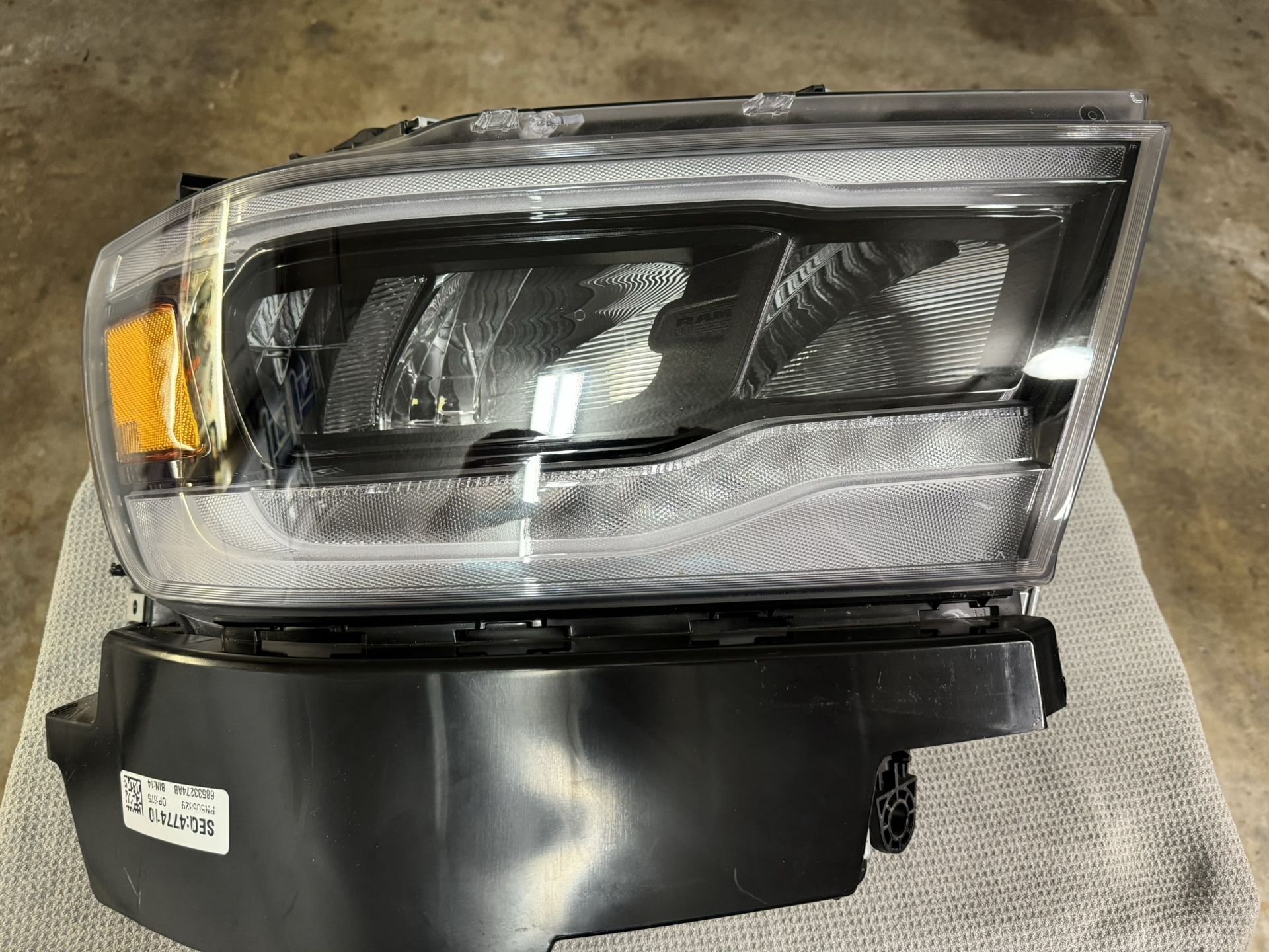 OEM Passenger side headlight for 2023 Dodge Ram 1500. This is from Rebel Model. Small scratch as noted in pictures barely visible. Works fine no issues.