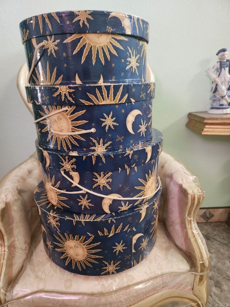 Blue and Gold moon and stars boxes are for hats. However, they can hold anything you wish. They are in pretty good shape. They look nice stacked on the floor in a corner. There's 4 round boxes. This item is only $5 bucks for the set. pick up and cash only.