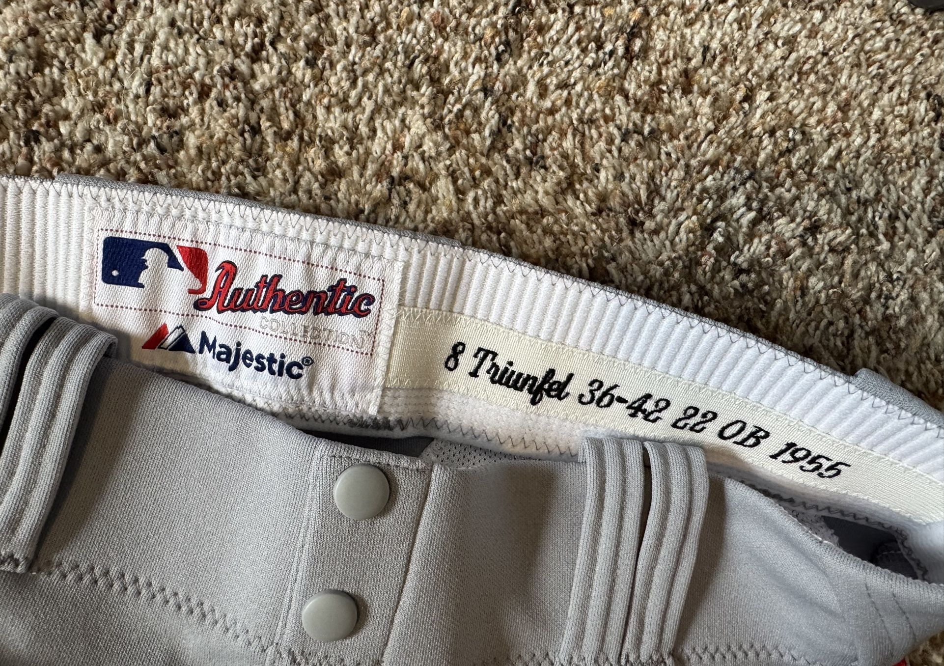 Authentic baseball pants made for former Seattle Mariners prospect Carlos Triunfel. These were made for the 2012 Turn back the clock game against the Oakland A’s, when the Mariners wore 1955 Seattle Rainiers throwback uniforms and Oakland wore 1955 Oakland Oaks uniforms. MLB Authentic Collection Made by Majestic. Triunfel did not play in the game so the pants are still in great condition. Retro below the knee style. Picture of Ichiro wearing the uniform from that game for reference. Originally purchased from a Mariners Care charity auction.