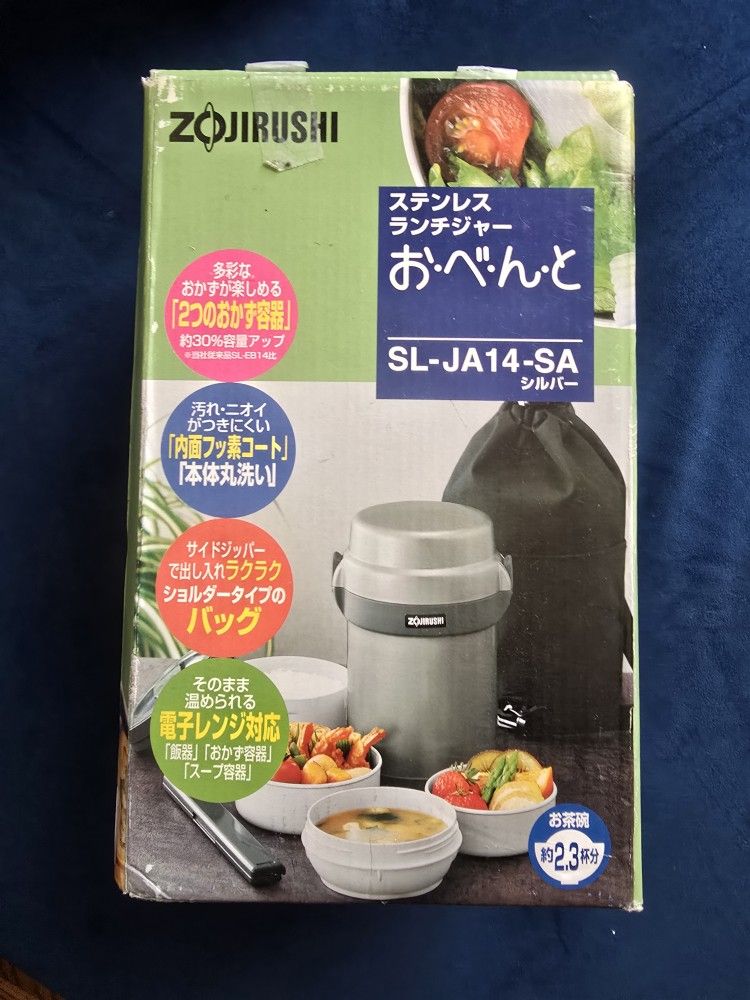 This is a Zojirushi SL-JA14-SA Mr. Bento Stainless Lunch Jar in silver. Features vacuum insulation for superior heat retention. Includes multiple inner bowls that are microwaveable (lids must be removed). The containers have a nonstick interior coating for easy cleaning. Comes with a zippered carrying bag. Inner bowls are BPA-free.