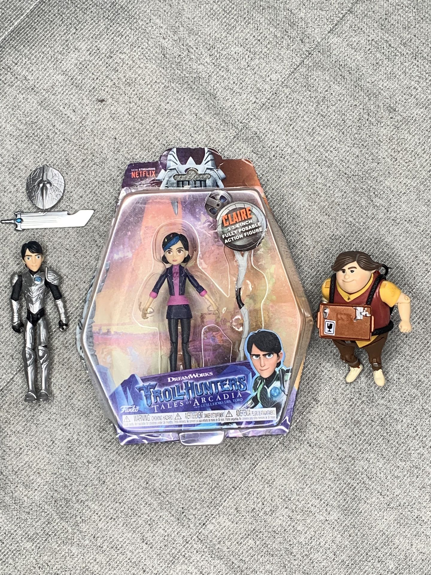 3 3/4" Troll Hunter Action Figures featuring Jim (with sword and shield), Toby, and Claire (new in box).