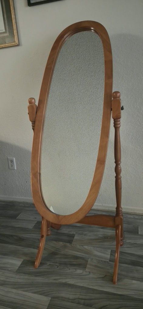 Full length standing wood floor oval mirror. Espejo ovalado de pie, de madera giratorio y de cuerpo entero.