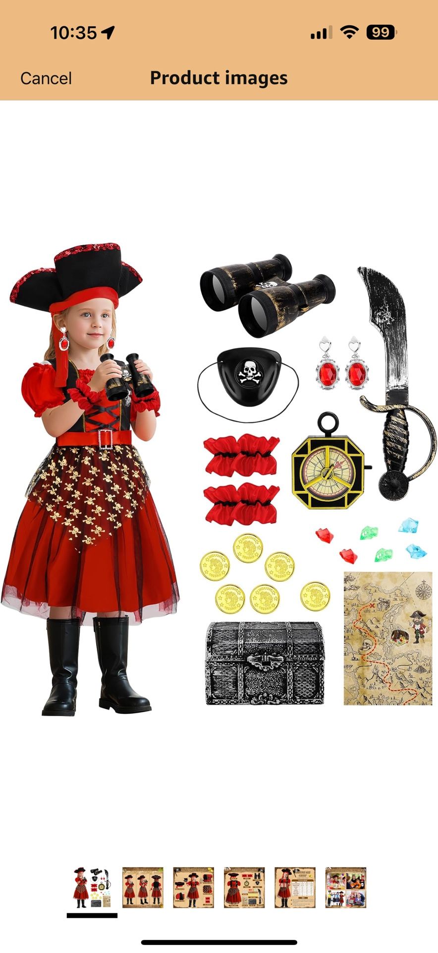 Description: Complete pirate costume for girls featuring a red dress with hat and fun accessories including binoculars, eye patch, sword, coins, and treasure items. Perfect for dress-up, Halloween, or themed parties. Suitable for ages 4–5 years.