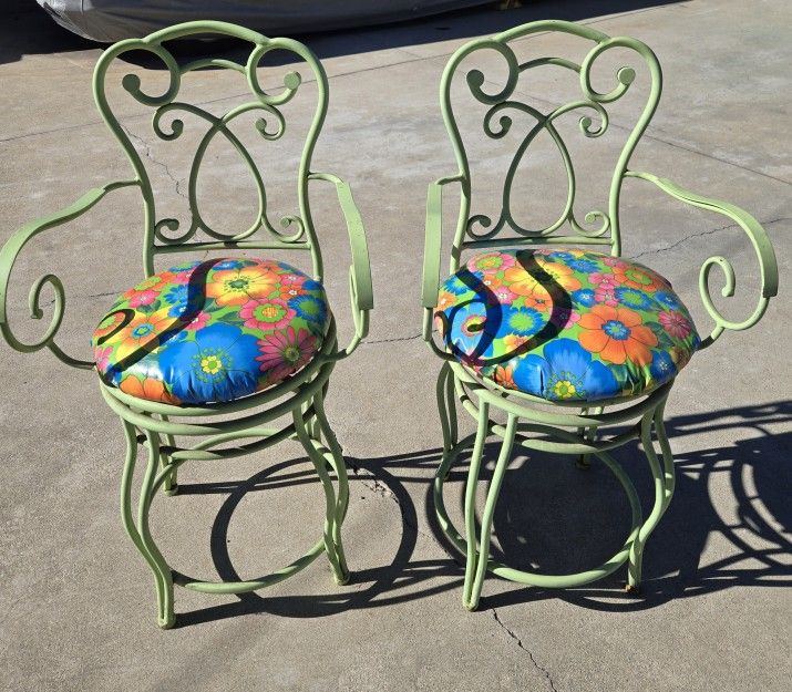 Vintage tall, 40" Wrought Iron, green peacock garden Chairs, swivel, perfect for patio or bar with waterproof floral cushions, in very good condition. They are heavy.