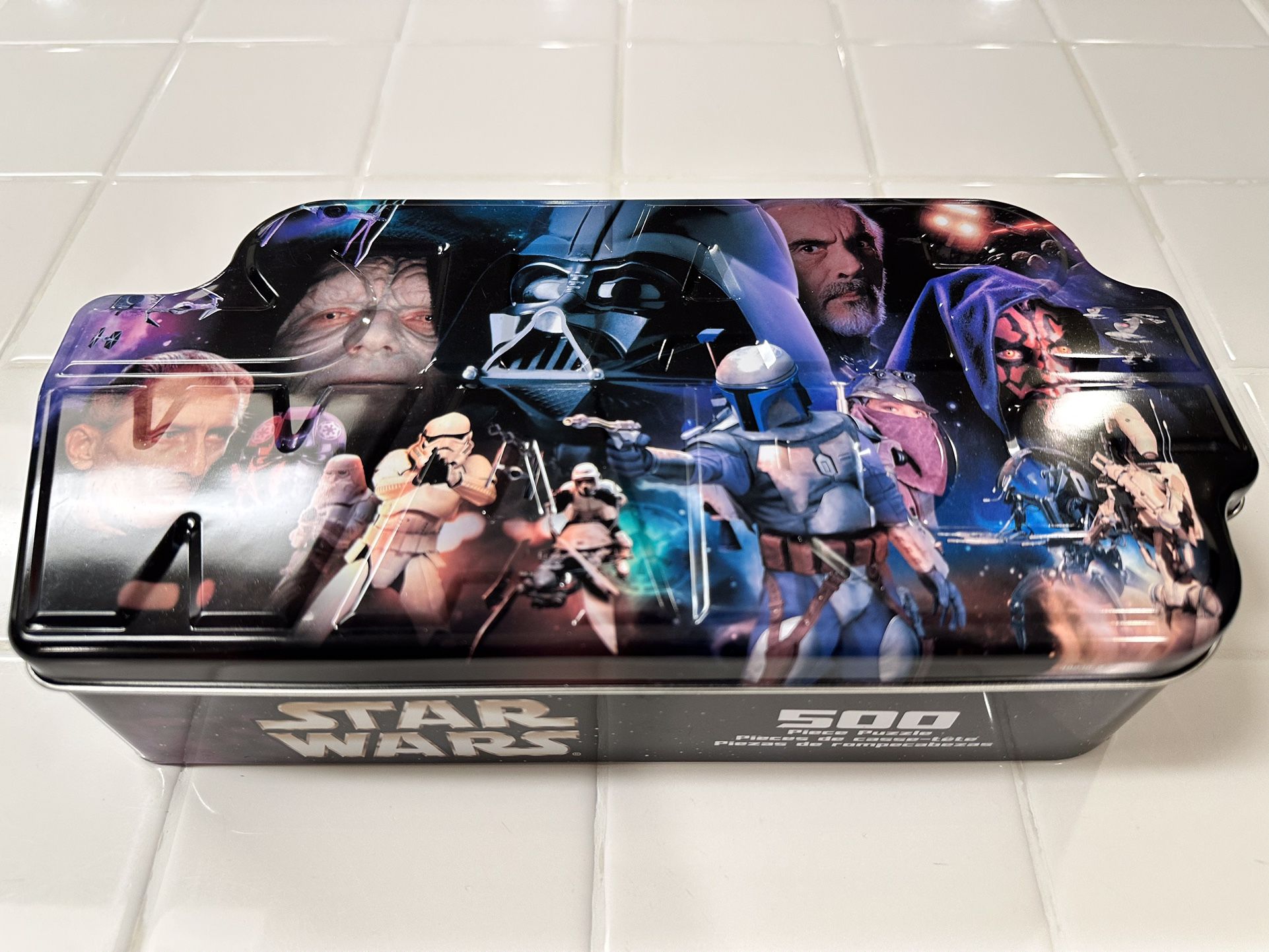 Star Wars 500-piece jigsaw puzzle with collectible metal storage tin. Puzzle is complete and in very good condition. Assembled once and stored back in the original tin. Features iconic Star Wars characters including Darth Vader, Emperor Palpatine, Boba Fett, Clone Troopers, and other fan favorites. Tin shows only light normal wear from storage. Great for Star Wars fans, collectors, or a fun puzzle night. Smoke-free home. Local pickup. Cash only.