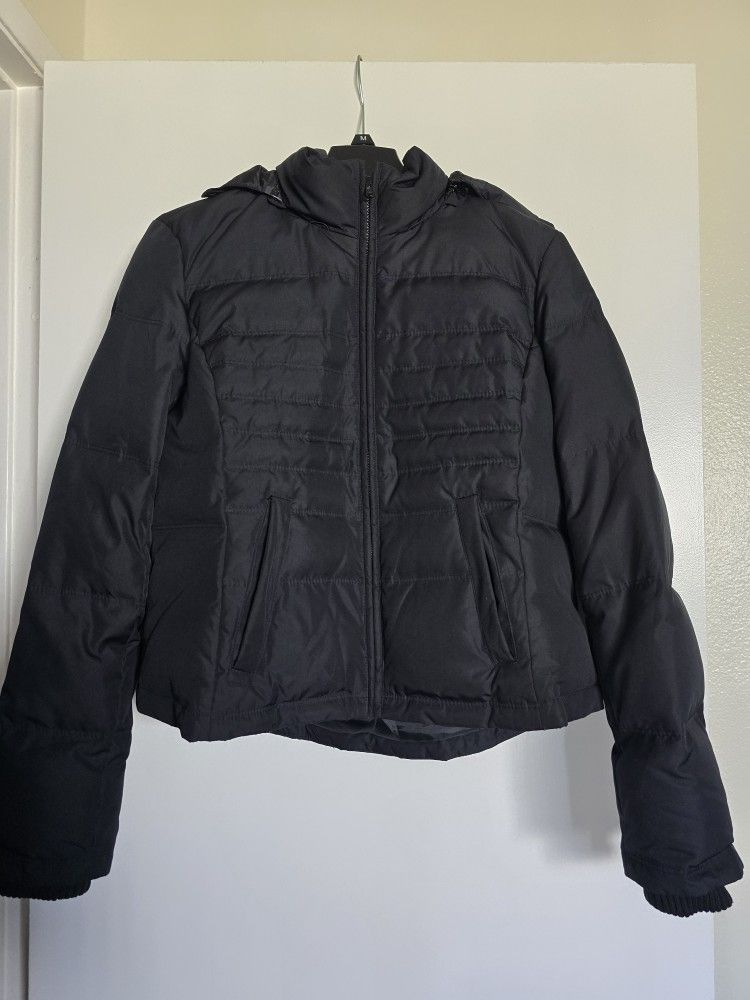 Good quality. Used twice but in great condition. Size 4 (similar to a small) in black. Detachable hoodie. Length is up to the waist. Outside shell made of polyester and inside lining is of down & waterfowl feathers. I bought it new for $200 but asking for $60. Cash only.