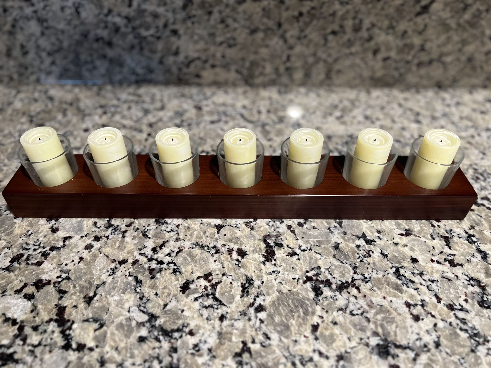 Wooden candle holder that holds 7 candles in glass votives. Beautiful statement piece in your home decor. Purchased for $70 yours for ONLY $10 FIRM. Thanks!