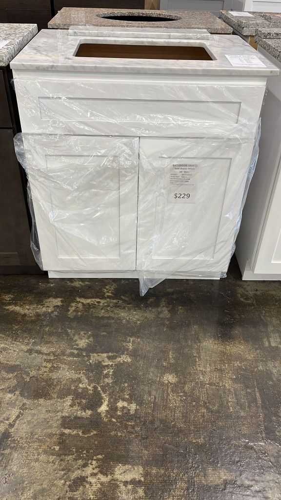 BATHROOM VANITY Sun SHaker White 30" Wide Vanity Type: Cabinet Box Construction: Plywood Deer Construction: Wood Price: $229