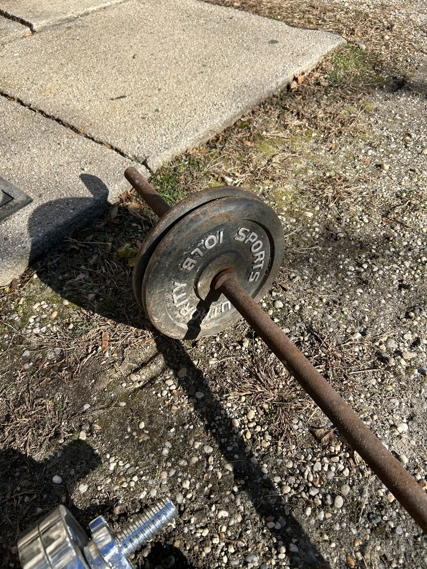 Wights and bar -$75 Dumbbells chrome set -$35 Dumbbells purple set-$15 Everything as a whole $95