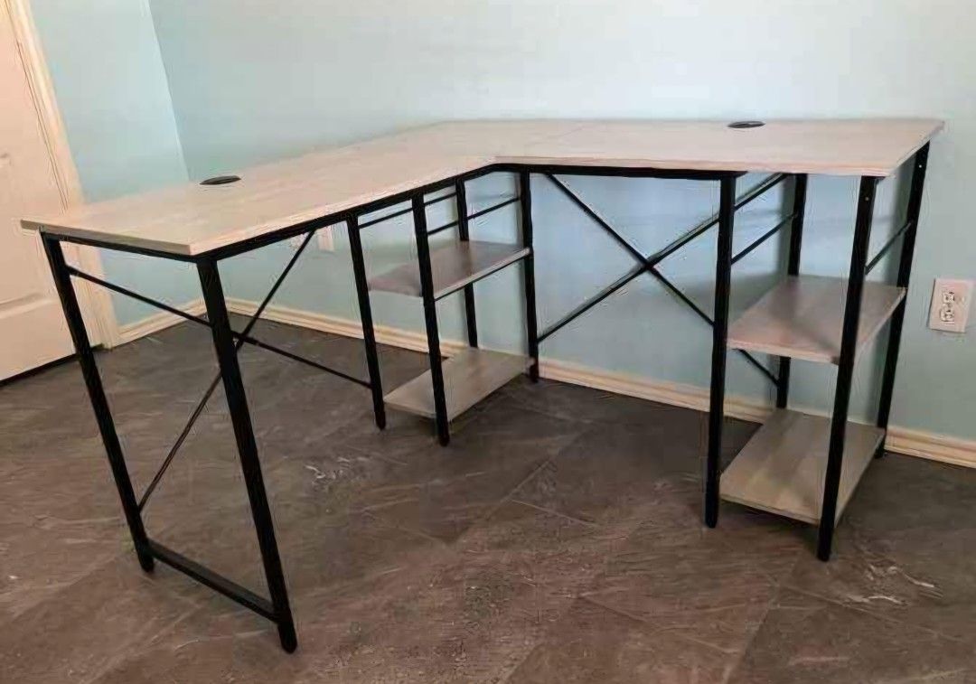 Oak colored desk that can be put together in an L shape or straight and has 4 shelves. Comes dissassembled and includes hardware. Measurements 29in tall 23 in depth 95in long when built straight 59in when built as an L Pickup near 91st Ave and Peoria