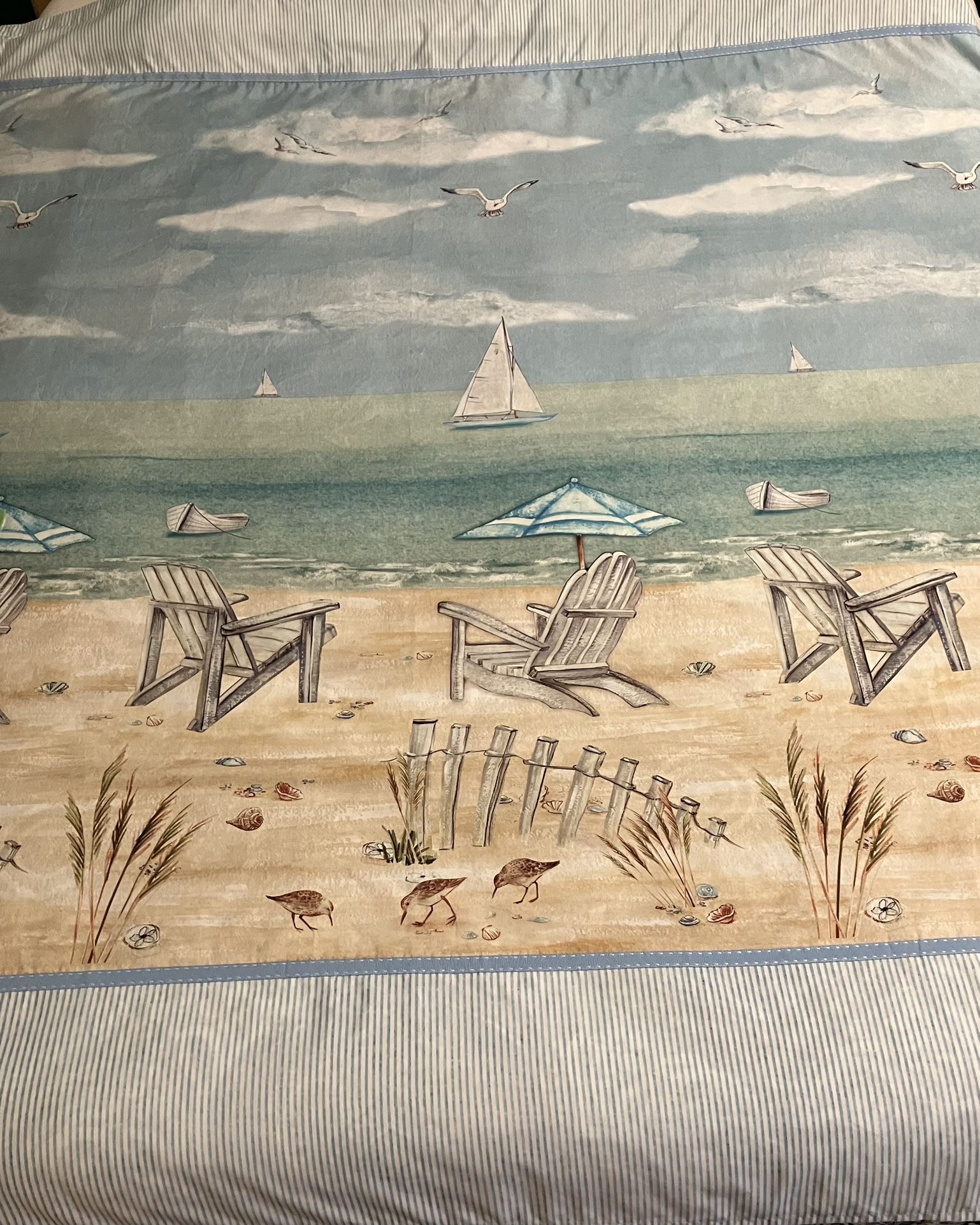 Polyester 72” H x 68” W Turn your bath into a serene beach day with a scene of sailboats, beach chairs, sun umbrellas, birds, water and sky! Light blues, turquoise and sandy beige Excellent condition