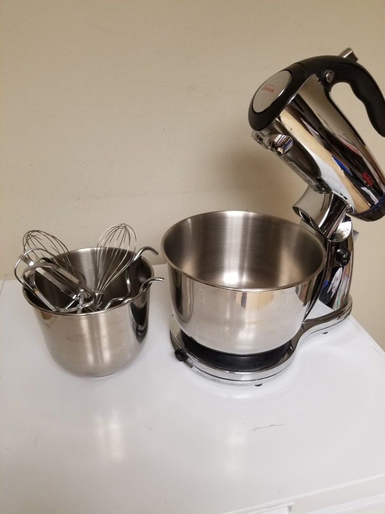 Sunbeam Mix Master 12 speed stan Mixer -300 watt -Model 2379 Chrome 2 WHISKING Attachments , 2 Mixing / beater attachments and 2 Dough hook attachments. 2 Stainless Steel bowls that lock into spinning base mount. Base mount moves to center the beaters or place them closer to the bowls edge. 12 speeds with an additional power boost button on top . Excellent condition $50 Located North Phoenix near I-17 & Greenway rd