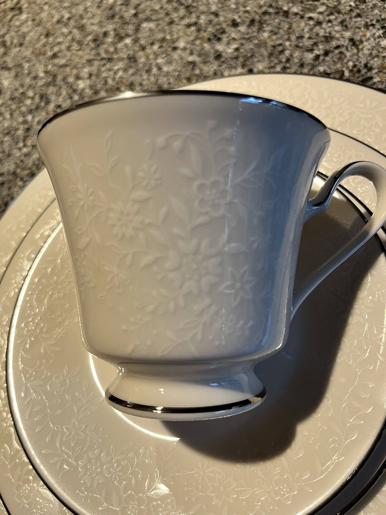 Five piece Setting sto include dinner, salad, dessert and saucer, plates, and cups. 28 total pieces excellent quality.