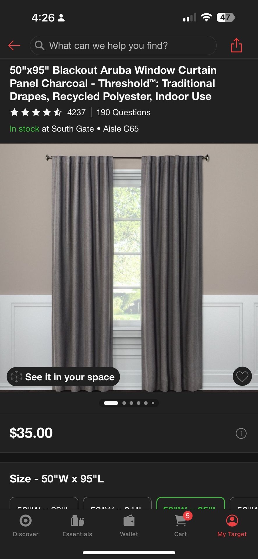 Grey curtains Description in picture Used Non smoking home retail $35 plus tax each . Black out Target Threshold by target 4 available in this size $10 each