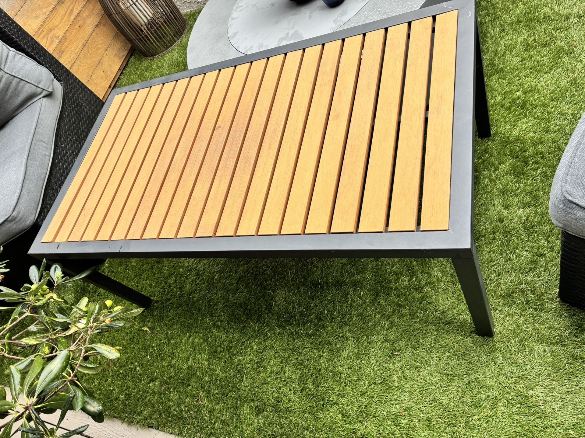 Outdoors Coffee Table in very good condition, sturdy metal framing Dimensions are 21.5”D x 39.5”Wx16”H