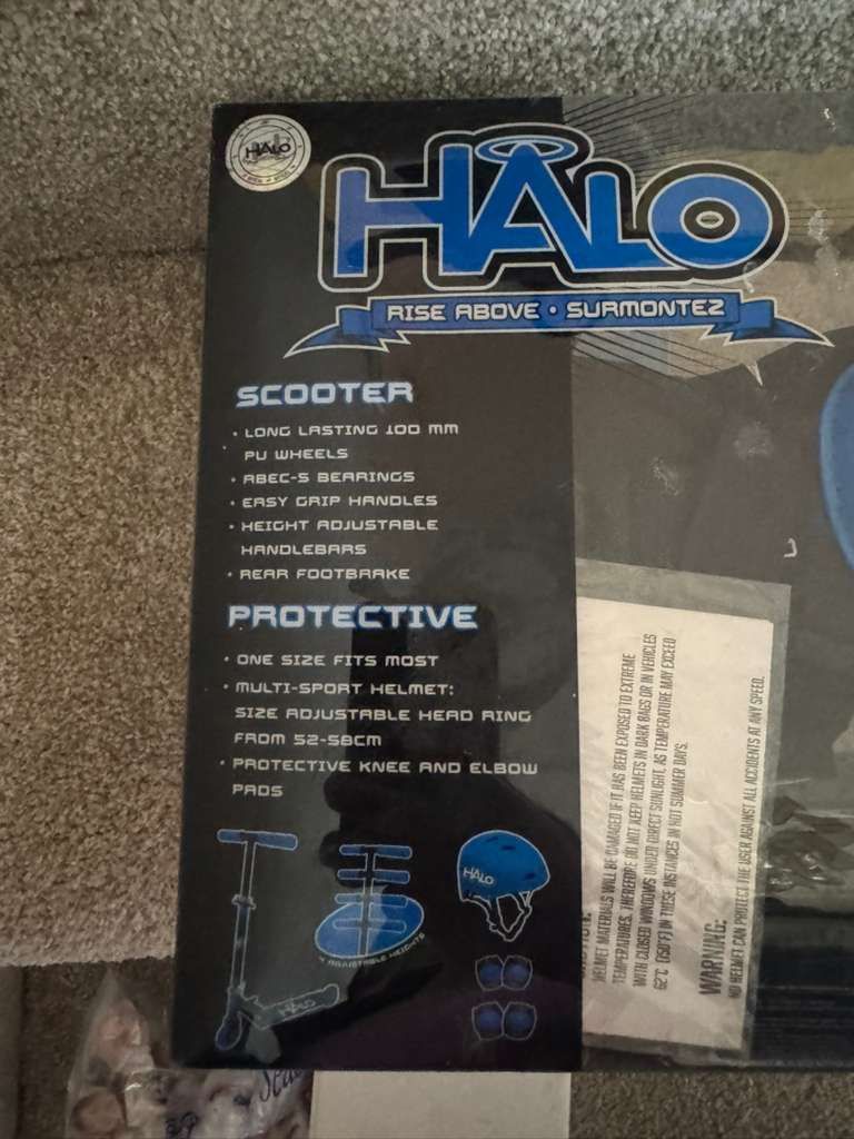 Brand new in package halo scooter with helmet and knee and elbow pads. Asking $30 or best offer