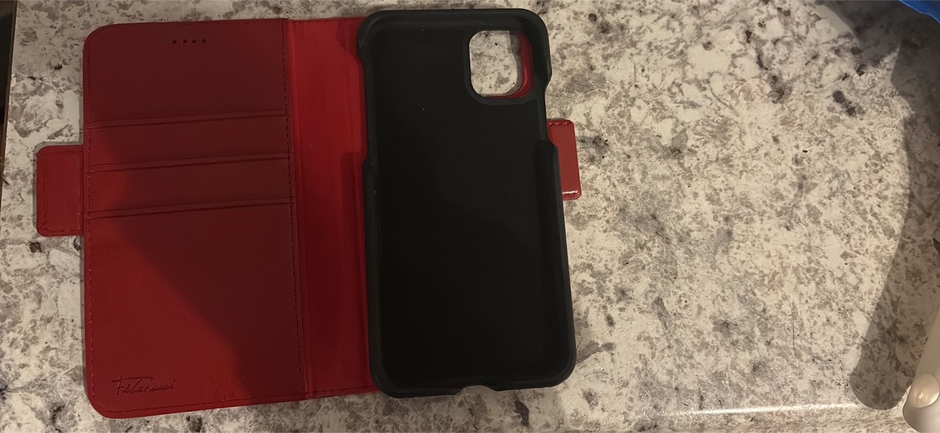 Red wallet-style phone case with card slots and magnetic closure. Phone case detaches from wallet. Used condition. Not sure which phone model it fits — please check photos.