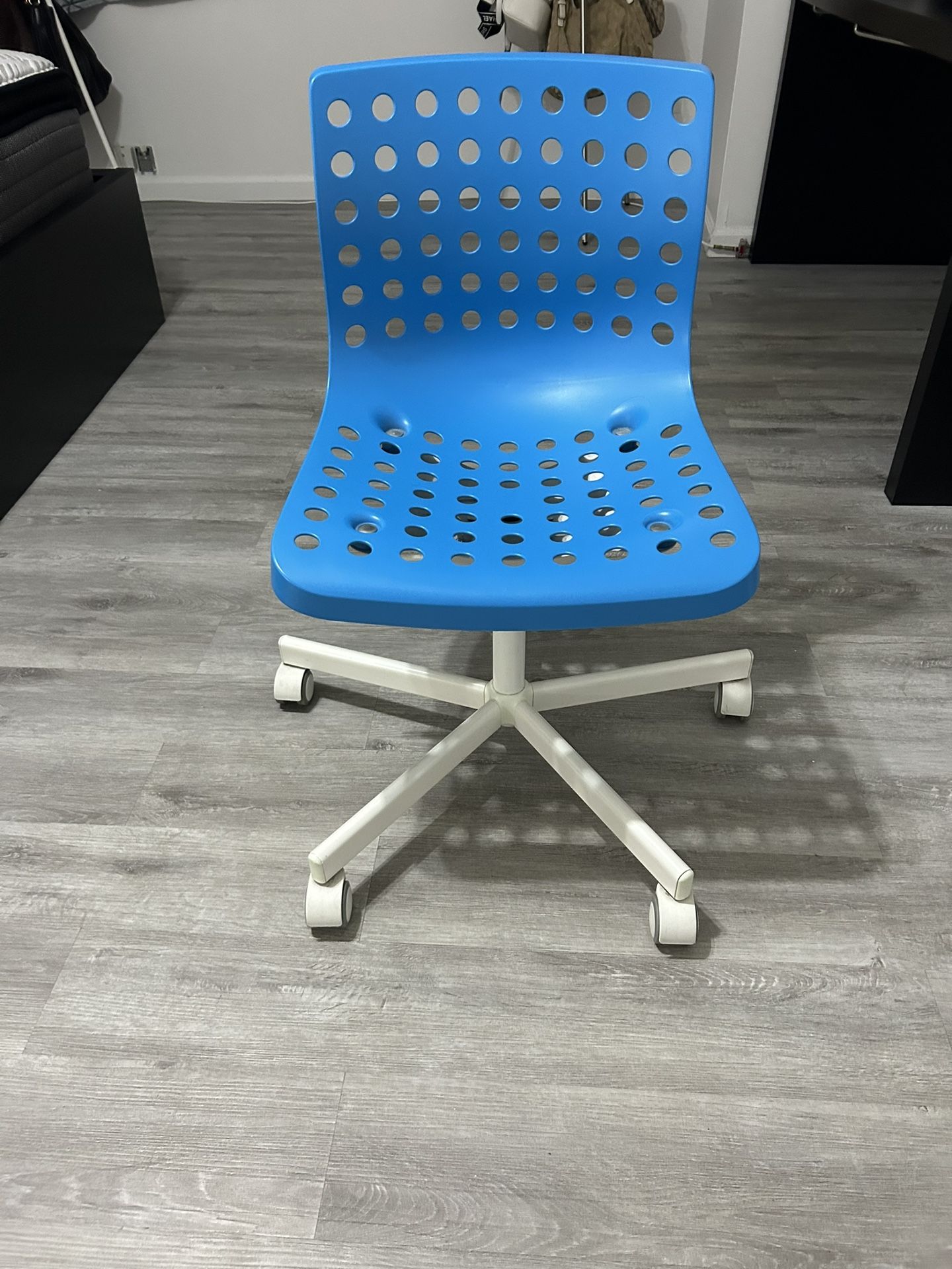 Blue swivel office chair in good condition, only thing is that the up and down mechanism does not work. Perfect for desk, study, or home office use. Features a durable perforated plastic seat for comfort and ventilation, smooth-rolling wheels, and a sturdy white metal base. Lightweight, easy to move, and fits perfectly in small or modern spaces. No cracks, stains, or damage.