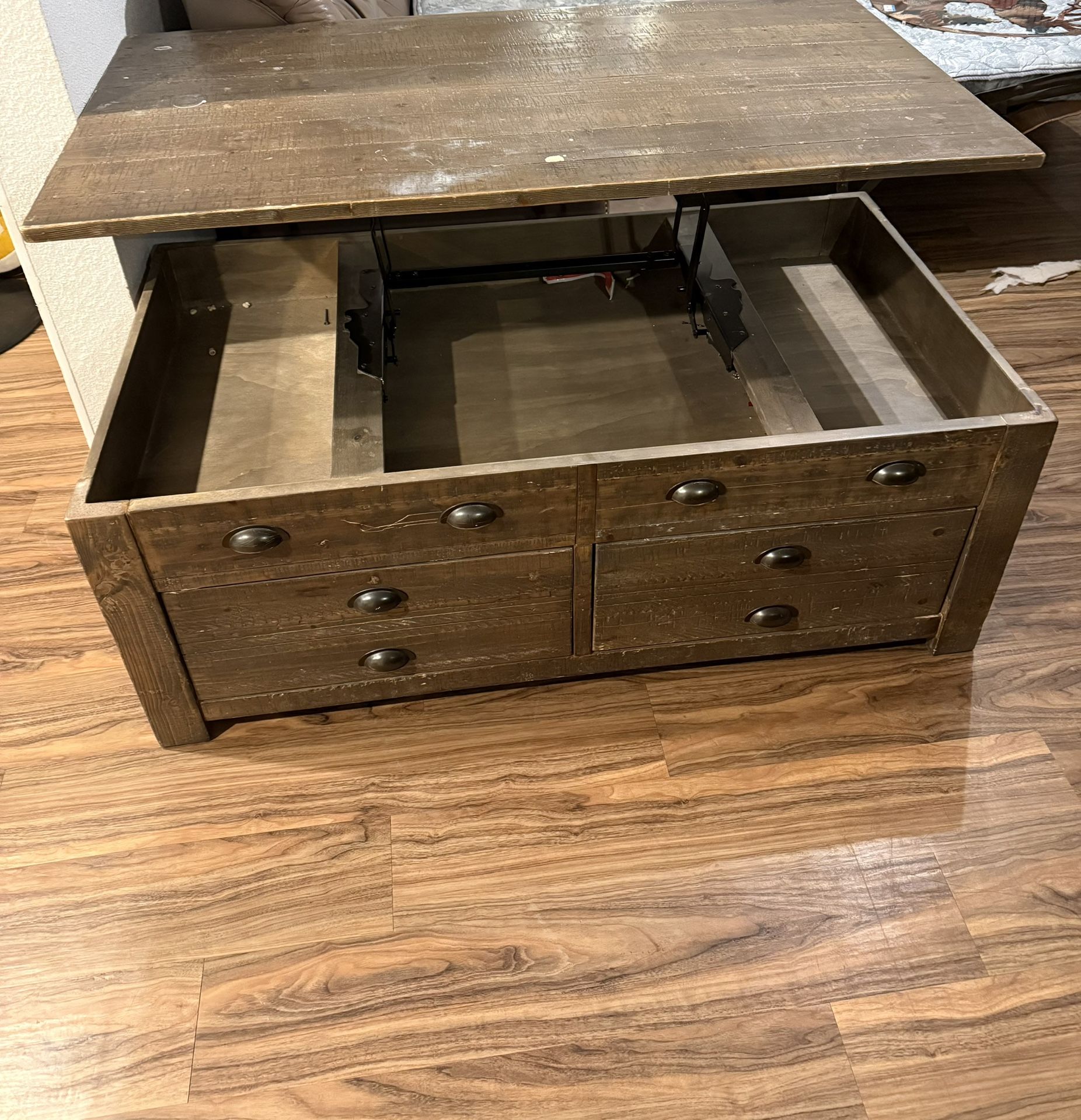 Nice hard wood table, top comes up as seen in picture for storage. Also has two bottom drawers