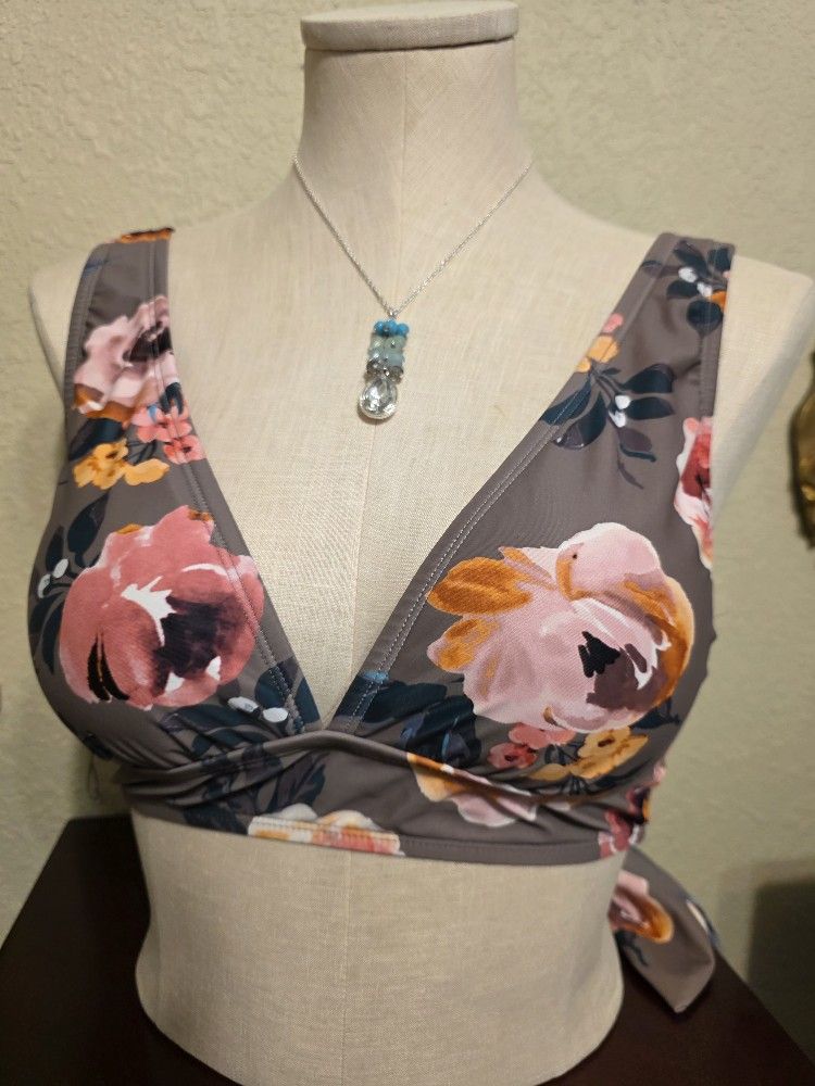 SHADE &SHORE FLORAL BIKINI TOP. TIES ON BACK. SIZE MEDIUM. NEW NO TAG. INCLUDES MATCHING NECKLACE.