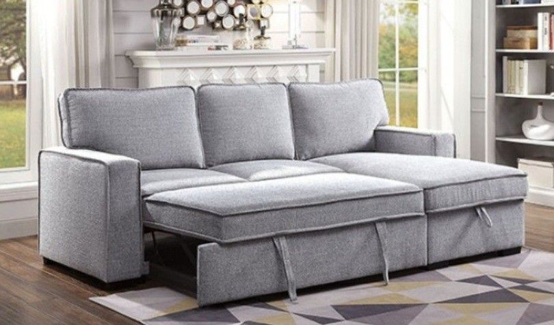 βπ« We do not have a showroom. We deliver directly from the manufacturer to your home π . π Delivery is only $40 π οΈ Assembly is an extra charge. Price on assembly depends on which item you order! π΅ We accept cash on delivery Mattresses are sold separately π₯We are voted #1 on offer up, please also view other options on our page!!! Beds, bedroom sets, sectional, sofas, daybed, futon, vanity, dining set, chairs, recliner, Loveseat, dresser, queen bed, king bed, desk, kitchen cabinets, shaker cabinet, grey sectional, grey sofa CM6964-SECT This mid-size sleeper sofa sectional is a versatile piece that will grow with your evolving home style. Clean lines, including box pillows and track arms, keep this piece feeling modern whether you are furnishing your ?rst apartment or your forever home. The sofa quickly converts to a bed and the chaise features a hidden storage compartment for remote controls, gaming controllers, throws, and other essentials. Contemporary Gray Linen-like Fabric, Solid Wood, Others L-Shaped Design Pull-out Sleeper Reversible Chaise w/Storage Track Arms Sectional. 92 1/2"L X 60 1/2"W X 37"H
