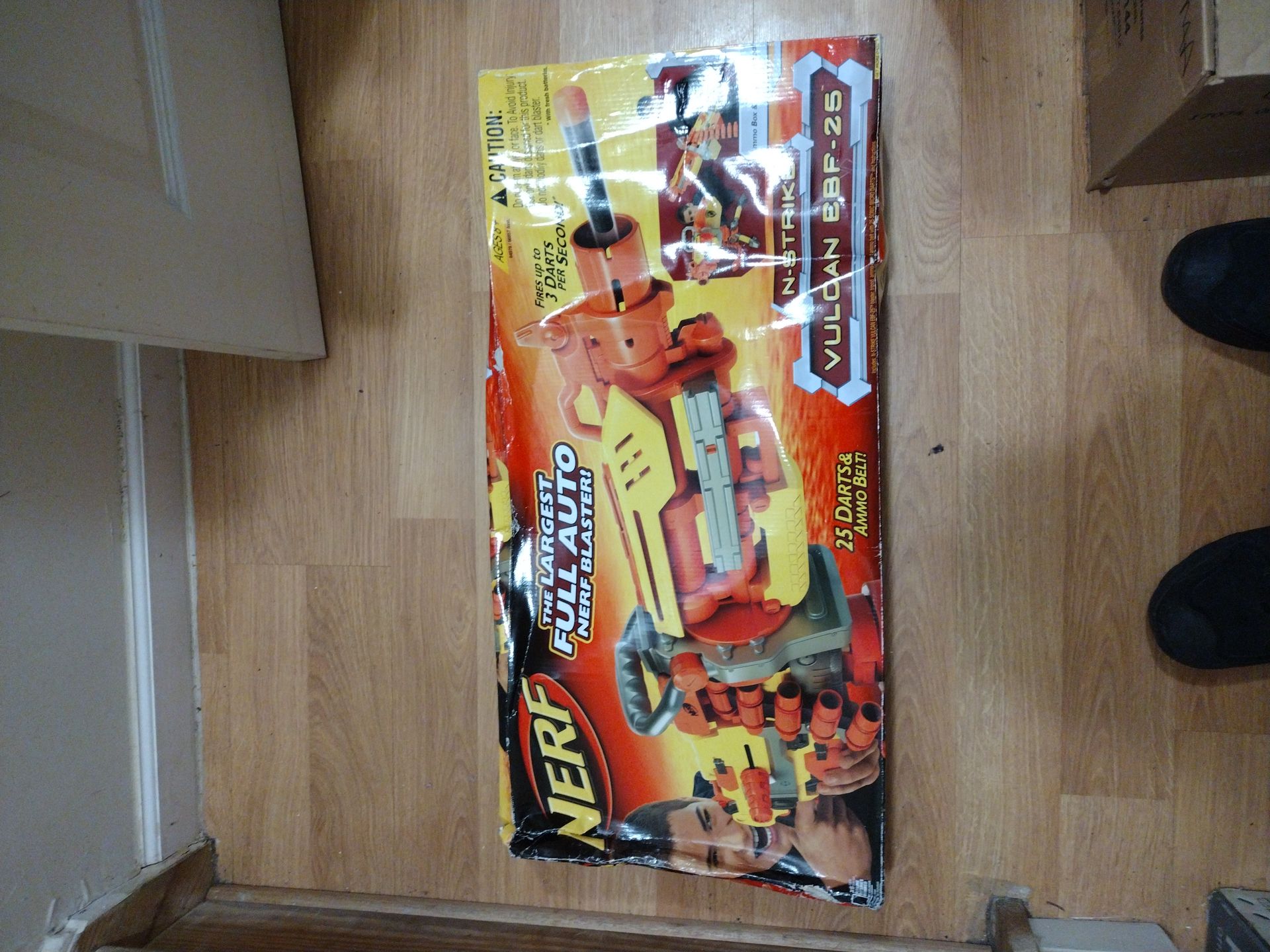 (New in box) Never used! Box is damaged but contents are in perfect condition!! Nerf N-Strike Vulcan EBF-25, an iconic electronic belt-fed blaster first released in Fall 2008. It was marketed as one of the largest and first fully automatic Nerf blasters, featuring a distinctive belt-fed system that can fire up to three darts per second. Key Features & Performance Dual Firing Modes: It offers both a battery-powered fully-automatic mode and a bolt-action single-fire mode for manual operation. Ammo System: It uses a 25-dart belt that auto-advances during firing. Multiple belts can be connected together to increase capacity, though the standard ammo box only fits one 25-round belt. Included Accessories: The original boxed set typically includes the blaster, a removable folding tripod, an ammo box, a 25-dart belt, and 25 Whistler Darts. Power Requirements: For automatic firing, it requires six "D" alkaline batteries (not included). Tactical Rails: It features three tactical rails (two on the sides, one on top) for mounting additional accessories like lights or sights.