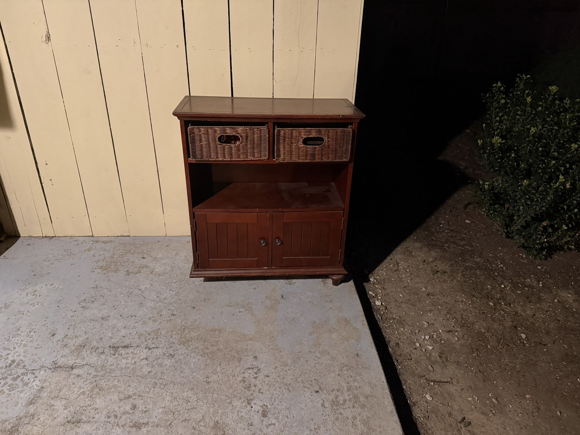 Nice cabinet with 2 basket drawers on top and two doors that open and close on bottom shelf. It’s heavy. You’ll need at least 2 strong people and a dolly to put it in your truck. One of the “feet” of the cabinet got knocked off as I was putting it outside. It is in the drawer. It’s a very nice piece. I’m just downsizing. I live in Ranch Peñasquitos area.