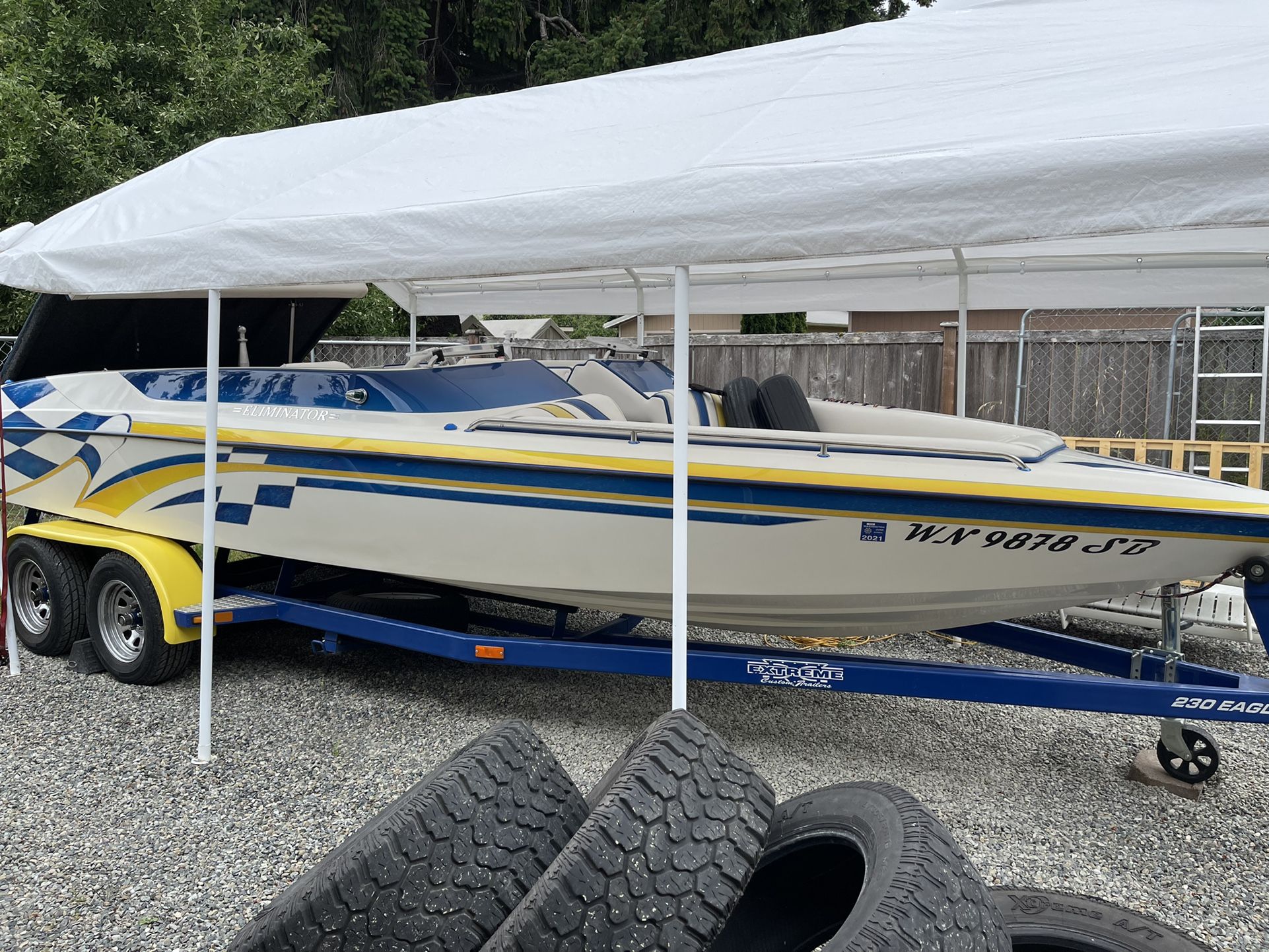 Testing the waters, 99 Eliminator MPI 454, 374hrs, fresh tune up, beautiful inside and out for a 22year old boat. New tires on Extreme trailer fold away receiver disk brakes . Questions please ask have new propeller and extra propeller 24p 4 blade SS. (2) JBL 12’s JL Audio amp, (4) 4”JL Audio and (6) 6❎9”