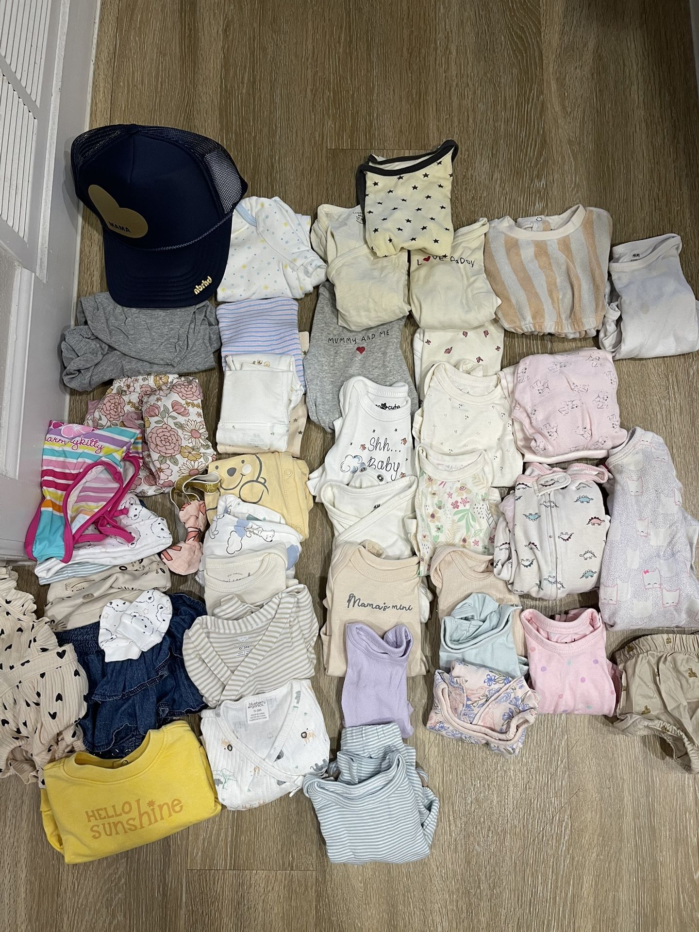 Newborn/0-3 clothes, breast pump, nursing cover, pacifiers, blanket, bottles, Motif c-section patches, product samples, hand breast pump, Huggies size 2(I have more), Tiny Love play mat, soft Hahaland books, sleep sacks.
