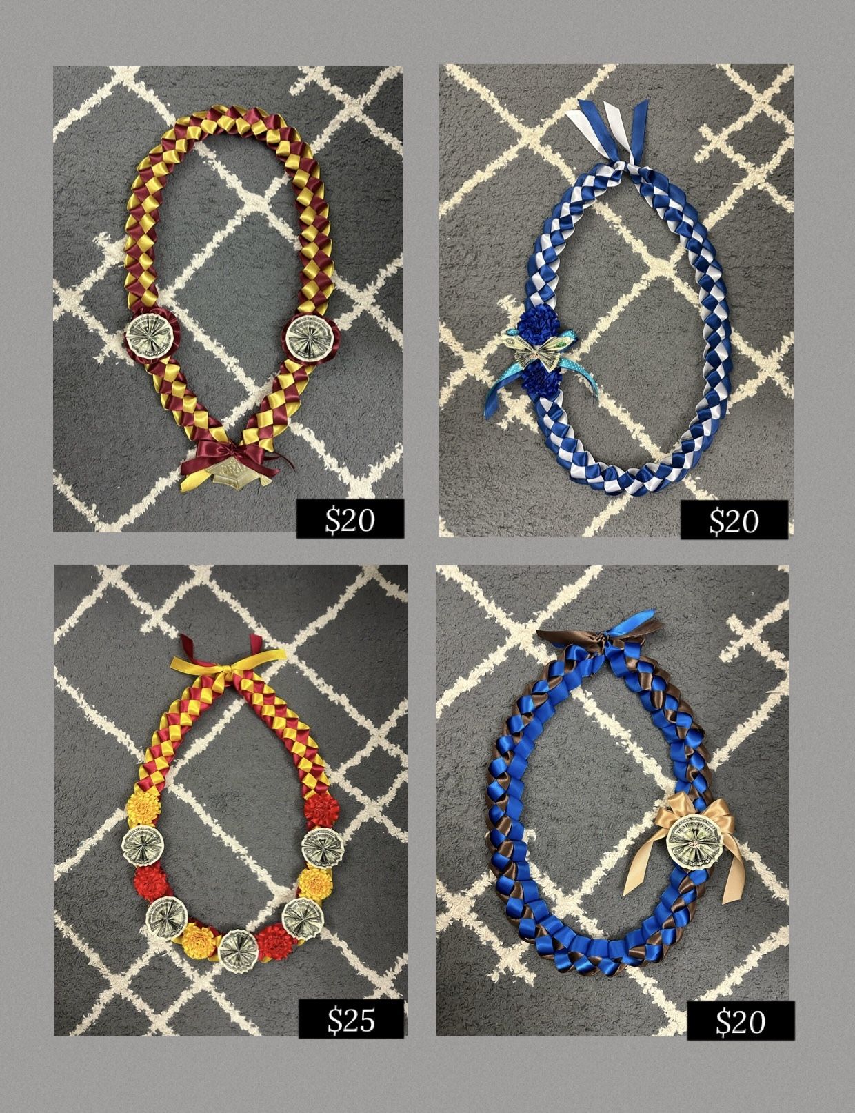 Graduation Leis Price as listed $20-25 Material: satin ribbons. Limited quantities available. 2 sizes available. This post here is for big kids (middle/high schoolers) First come first serve. Custom order available and requires full payment. All sales are final.