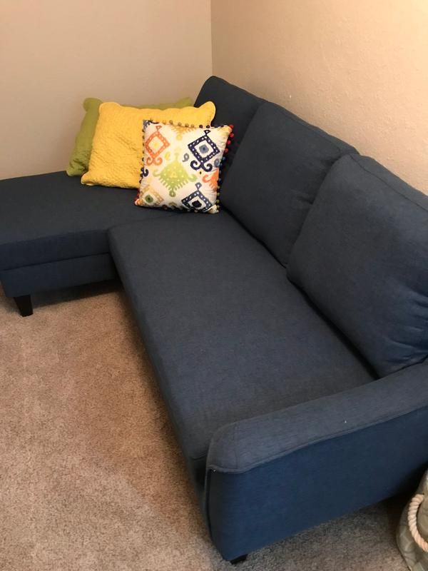 Selling My Navy Blue Modern Trundle Sectional Sofa. Comfortable Back and Seat Cushions, Smooth Fabric, Trundle Bed Pullout, Clean. Excellent Shape. Original Condition. Made by Ashley Furniture. Pickup in 92109 or Delivery with Zipcode. Dimensions: 83in Long, 33in Deep, 26in Tall, 53in Chaise/Trundle, 17in Seat.