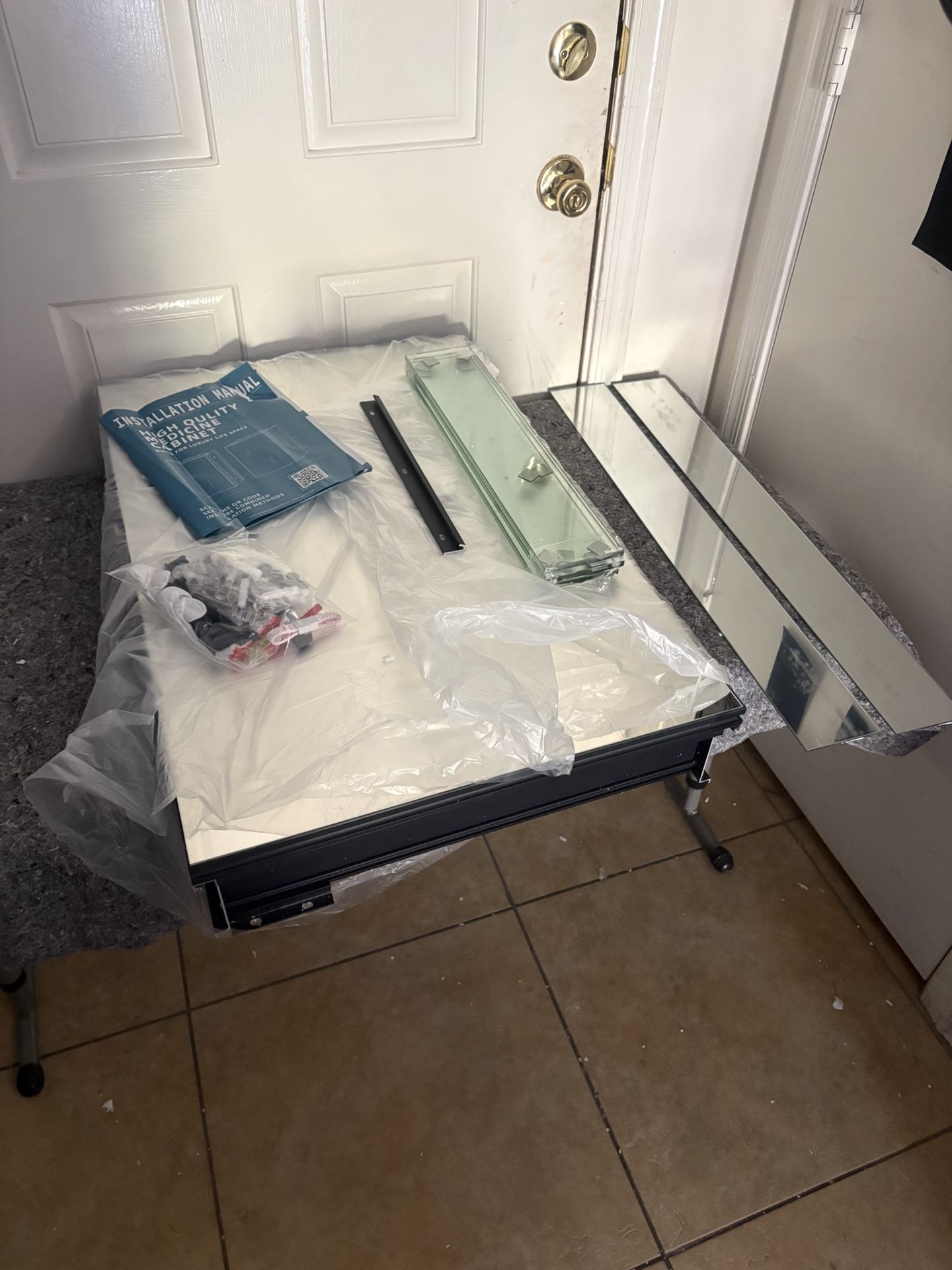 Black aluminum frame, 3 glass shelfs, 2 side mirrors, new in box Mirror: 19 5/8in wide, 29 1/2in long Cabinet: 19 3/8in wide, 27 3/4in long, 3 5/8in deep No Holds - Check Out My Page - All Sales Are Final