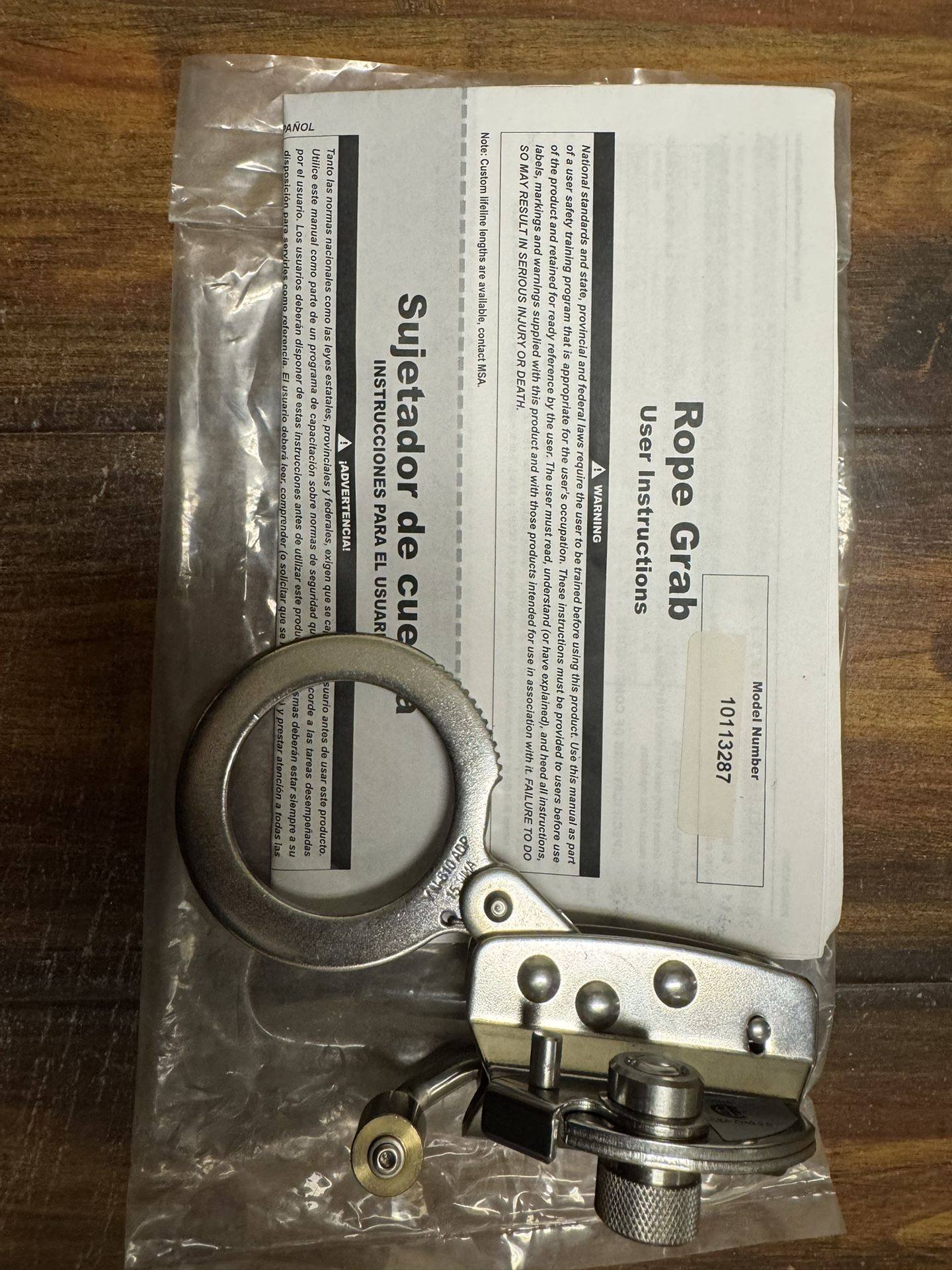 Rope grab by MSA. The leader in safety and full protection. Rob grab material is stainless steel Rope diameter 5/8” Rope type to be used is recommended Polyester Breaking strength 6000 Lbs. Attachment point is an O-Ring To be used with shock absorbing lanyard.